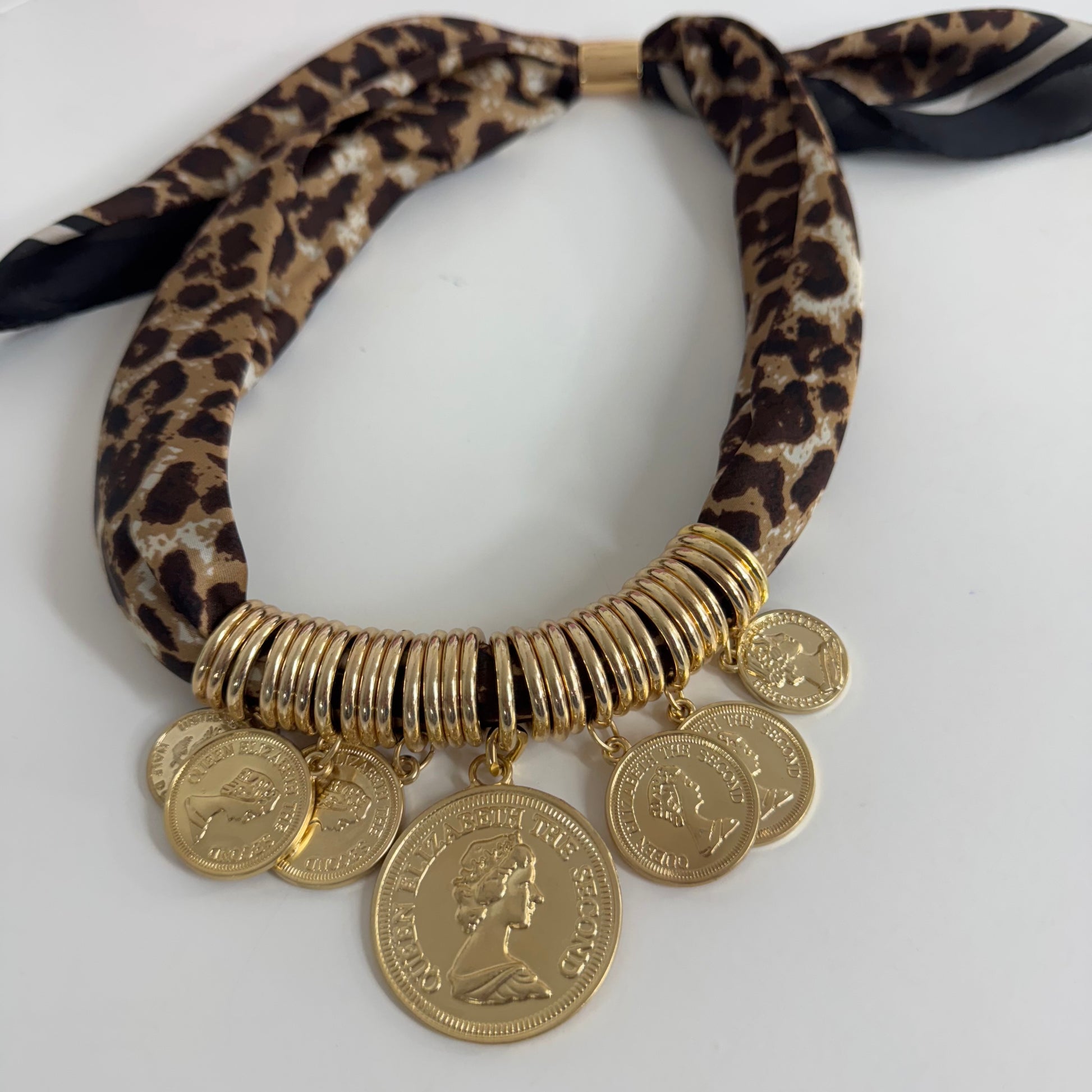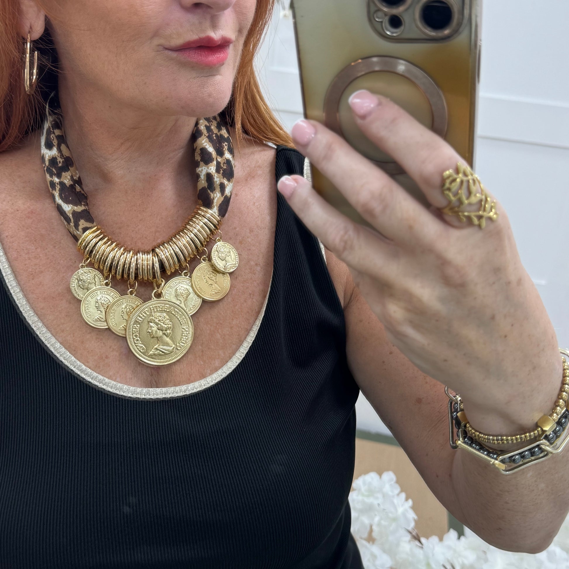 This statement necklace features chunky, polished gold coins in various sizes, creating a bold designer-inspired look. It’s a striking, statement accessory perfect for summer outfits or dressing up any outfit.