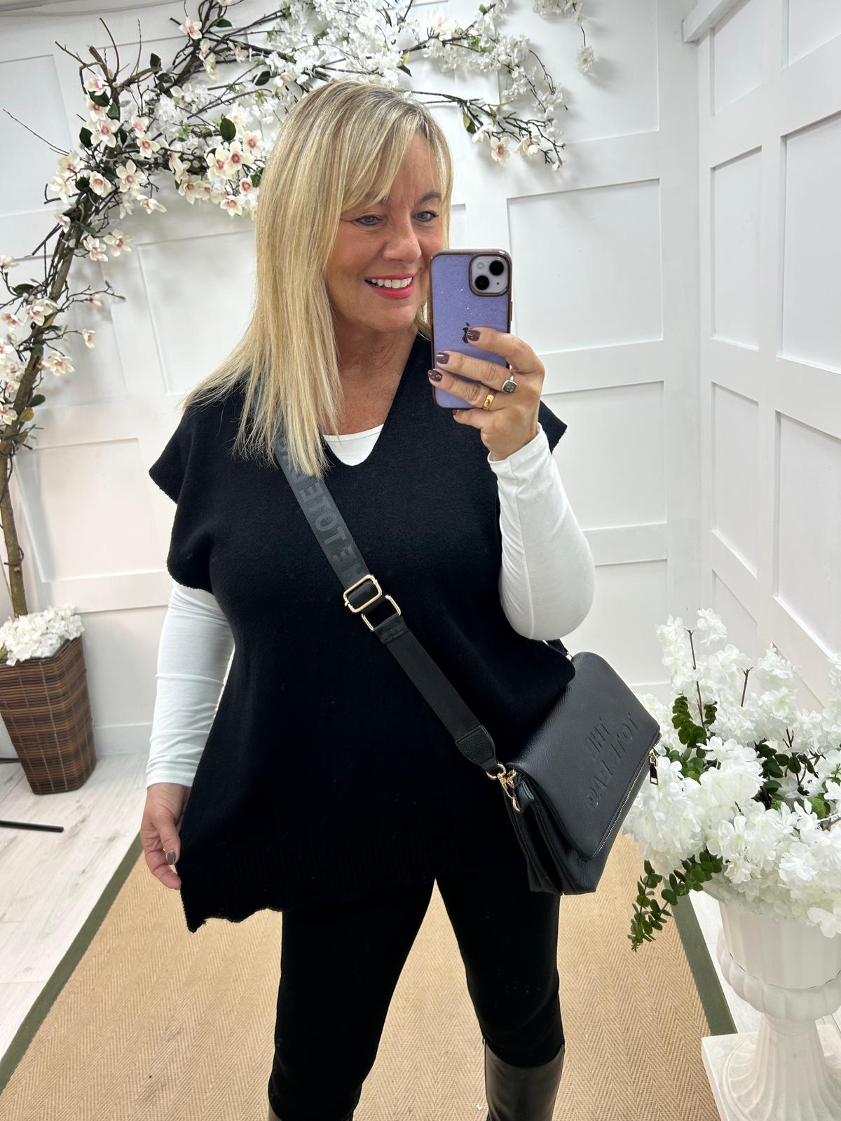 This mid weight, black knit top features a relaxed, oversized fit with dropped shoulders and short sleeves. Perfect for layering, it offers a breezy, casual-chic vibe with the button detailing along either side. The soft weave drapes beautifully, adding effortless elegance to any outfit. Style it with Trudy trousers for a fresh, autumn look.