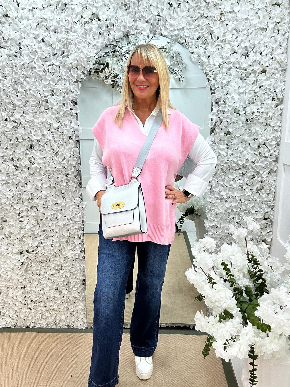 This mid weight, candy pink knit top features a relaxed, oversized fit with dropped shoulders and short sleeves. Perfect for layering, it offers a breezy, casual-chic vibe with the button detailing along either side. The soft weave drapes beautifully, adding effortless elegance to any outfit. Style it with Trudy trousers for a fresh, autumn look.