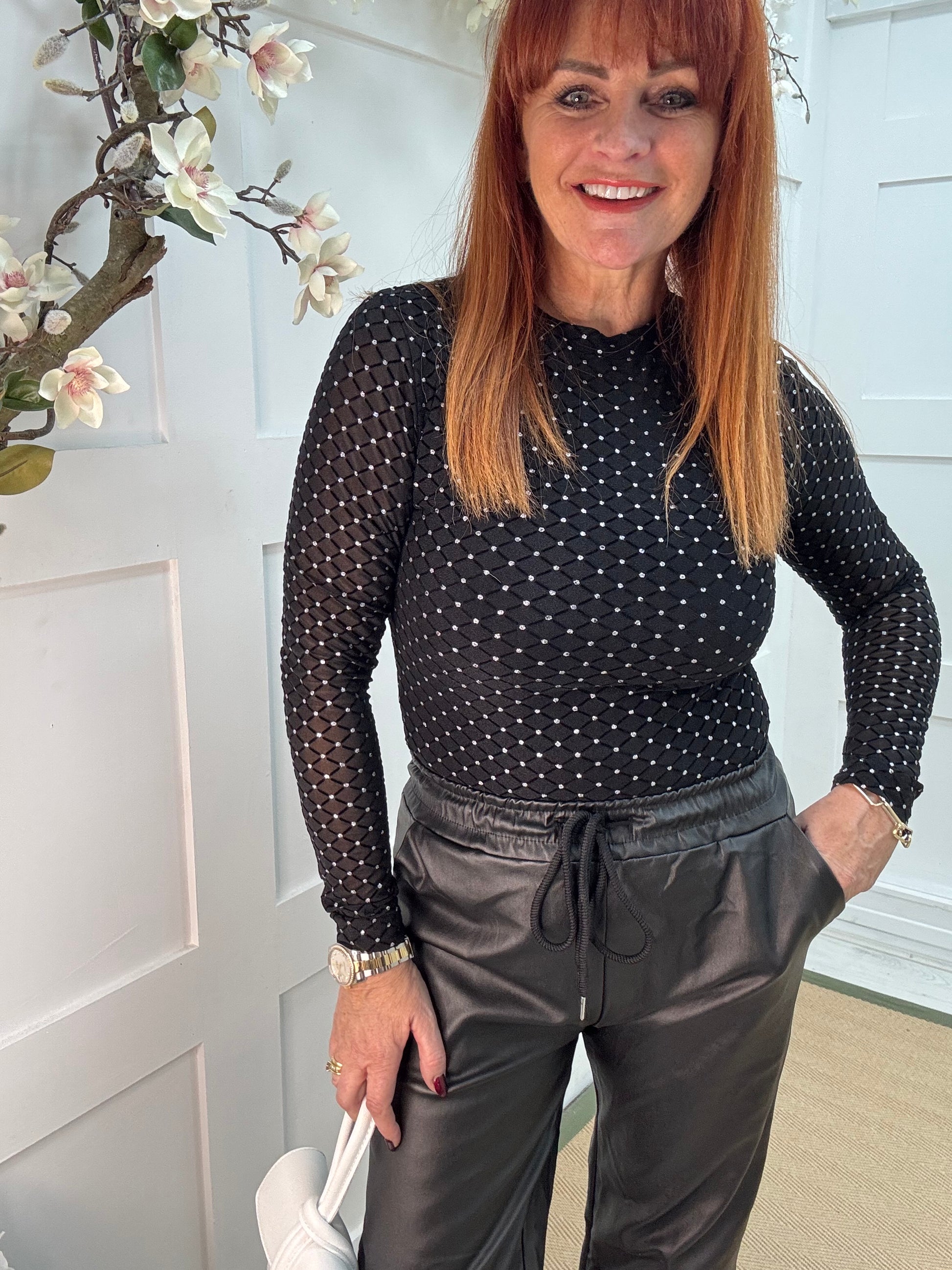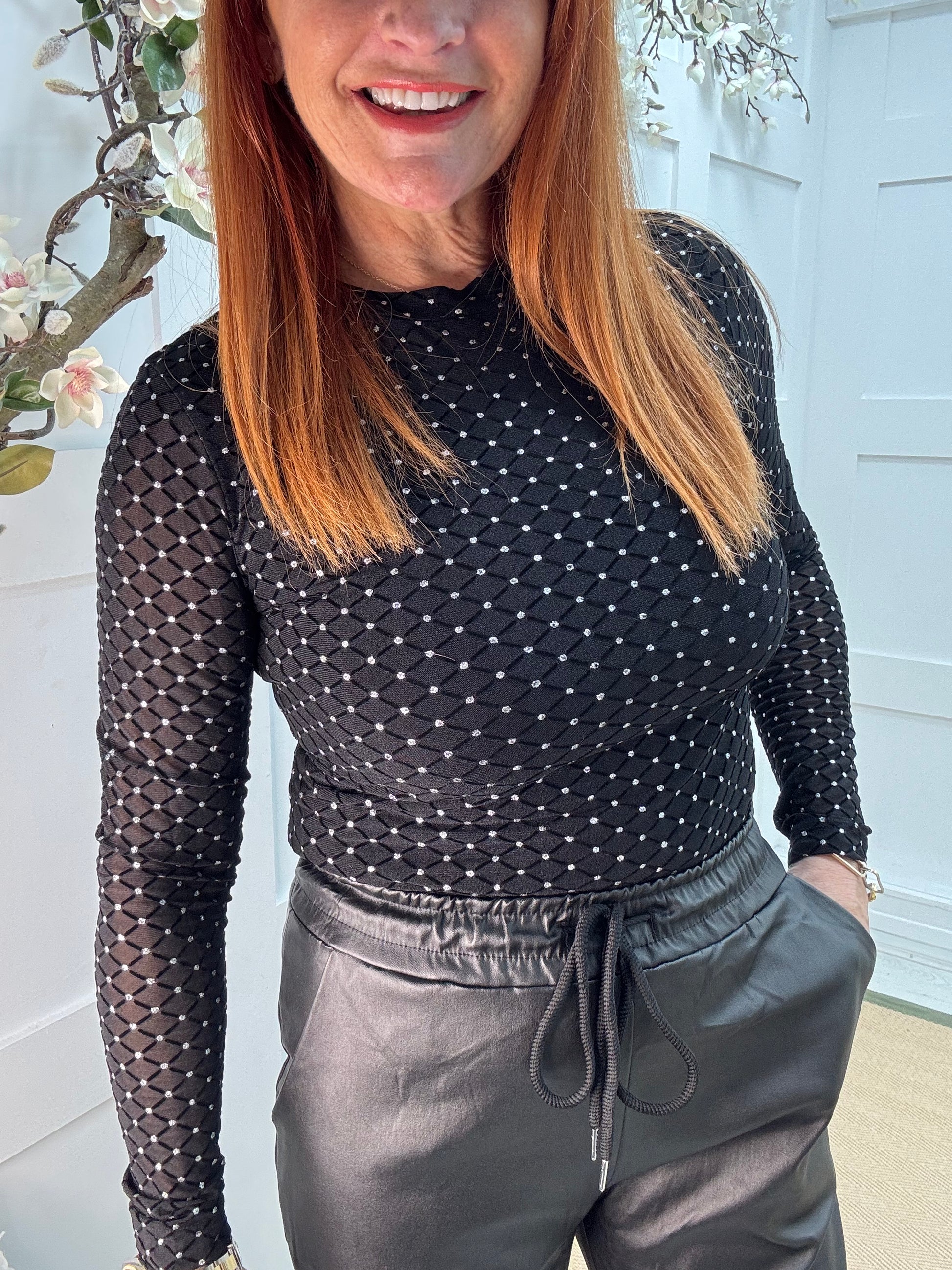 This sleek mesh, long-sleeve bodysuit in a chic black offers a smooth, figure-flattering fit with a striking silver glitter design all over. Designed with a round neckline, it creates a clean, elegant silhouette perfect for layering or wearing solo. Its stretch fabric ensures comfort while maintaining a polished, streamlined look.