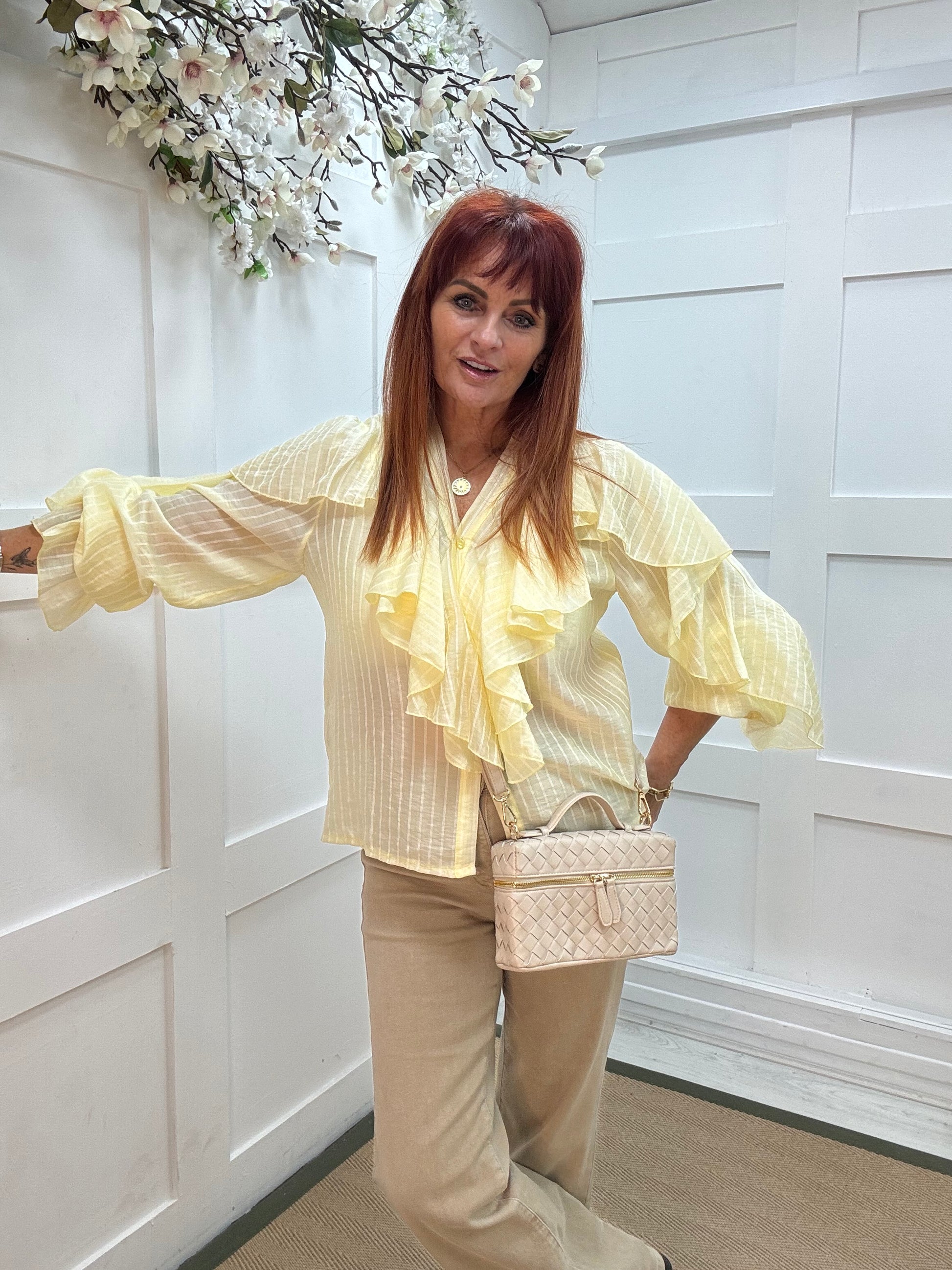 Raye: Lemon striped ruffle blouse. One size 10-14