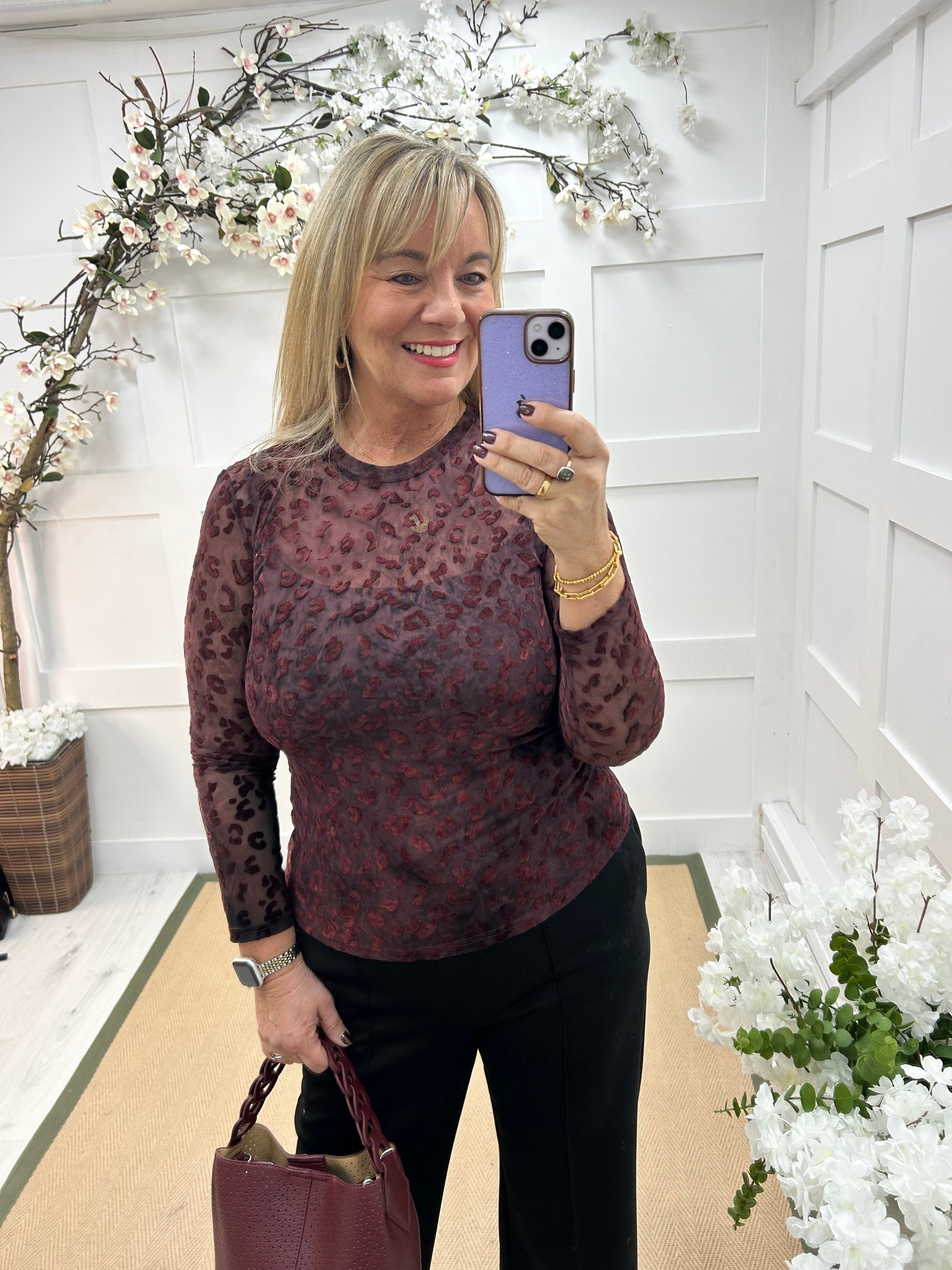 Rhianna: Burgundy velvet leopard print mesh top. One Sz: 10-16