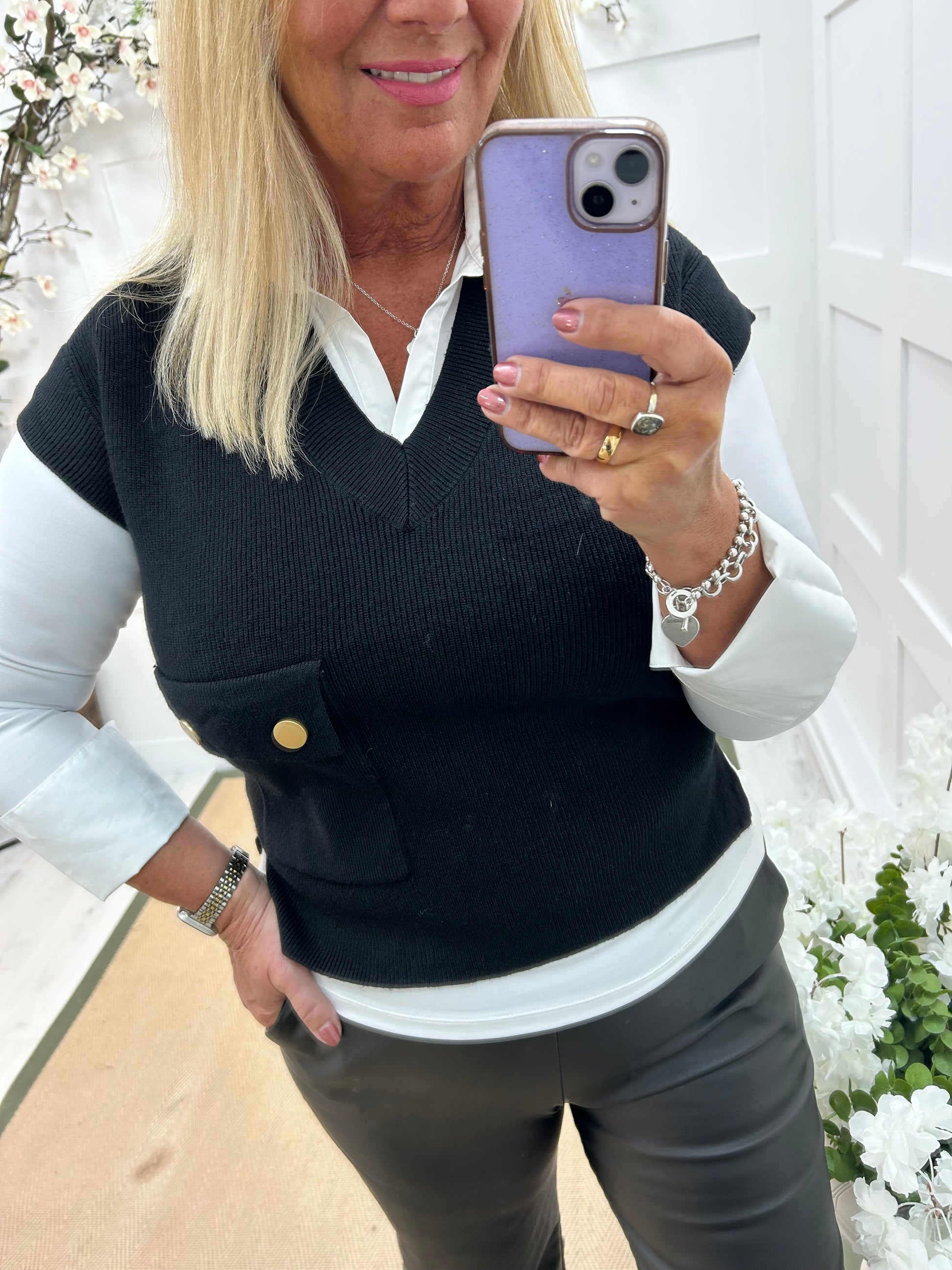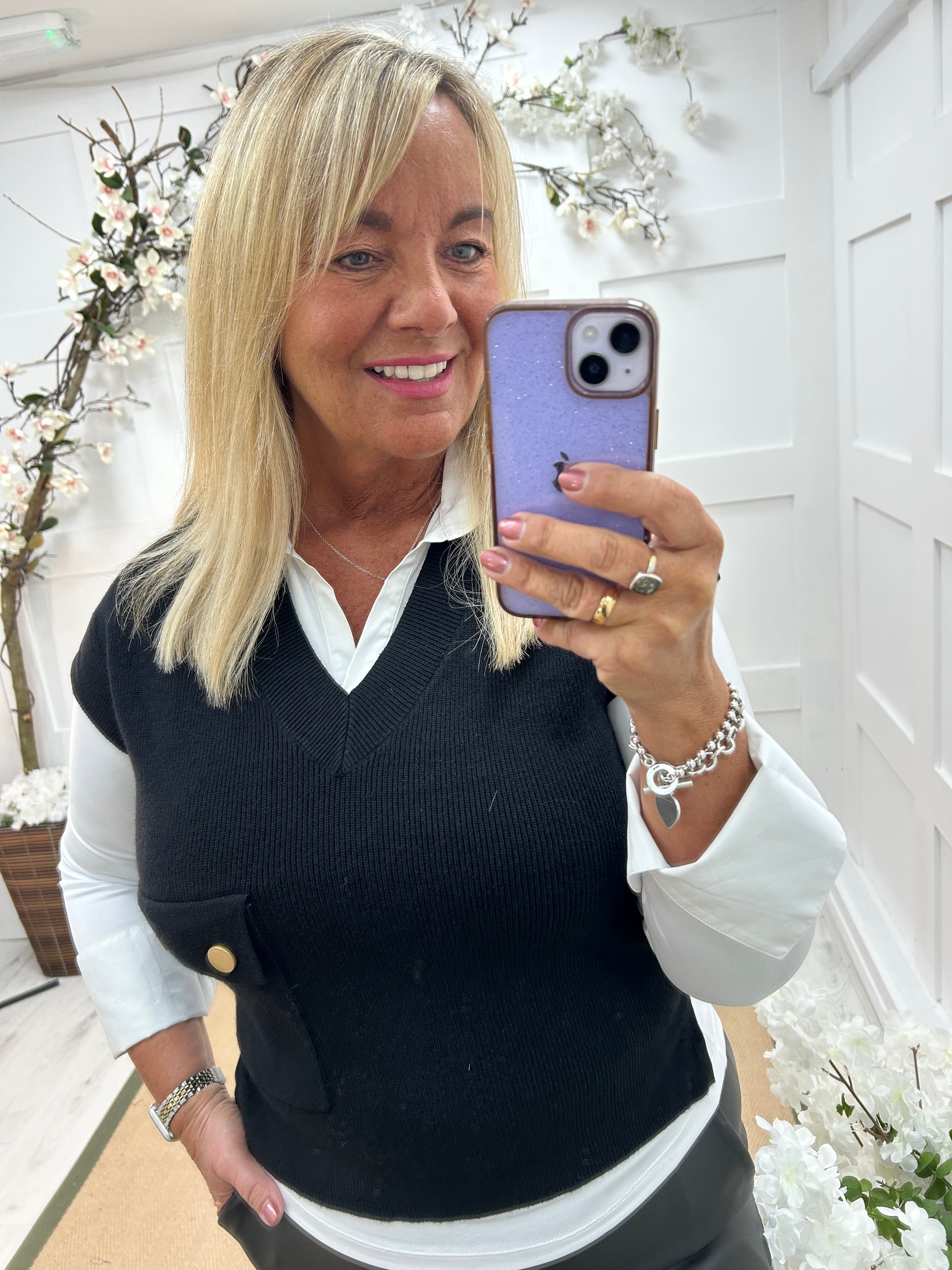 This stretchy knit tank top is effortlessly chic with its soft fabric and relaxed fit. Featuring two gold buttons on the pocket, it blends comfort with understated elegance. Perfect for pairing with leather trousers & our Layla shirt, it’s a versatile piece for both casual and dressy looks