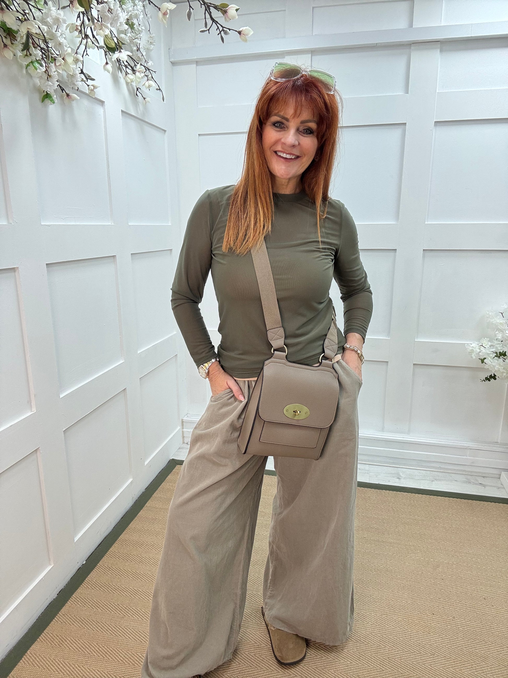 Romy: Khaki sheer mesh top. One Sz: 12-18