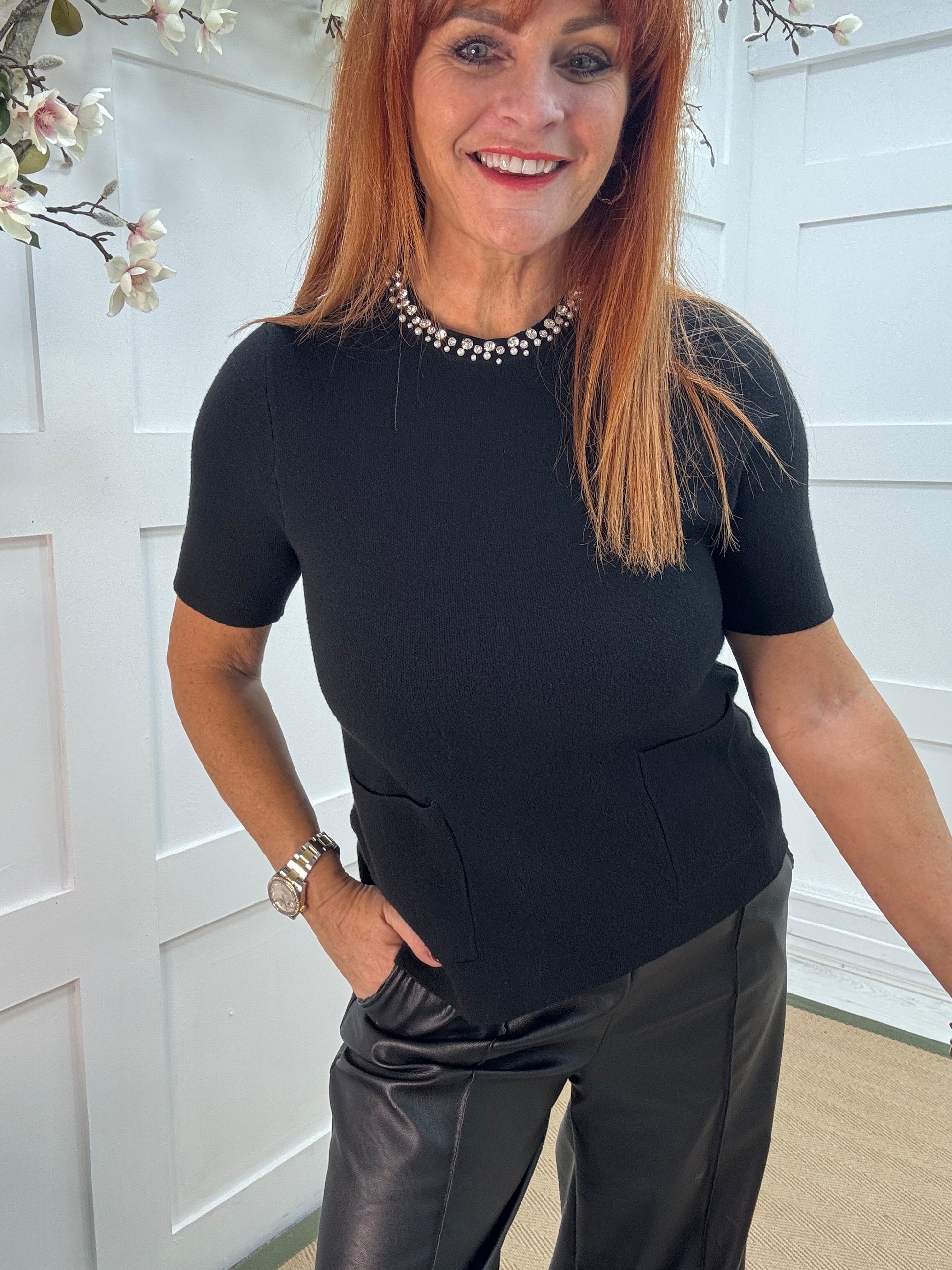 Rosheen: Black rhinestone pocket top. One size: 8-14
