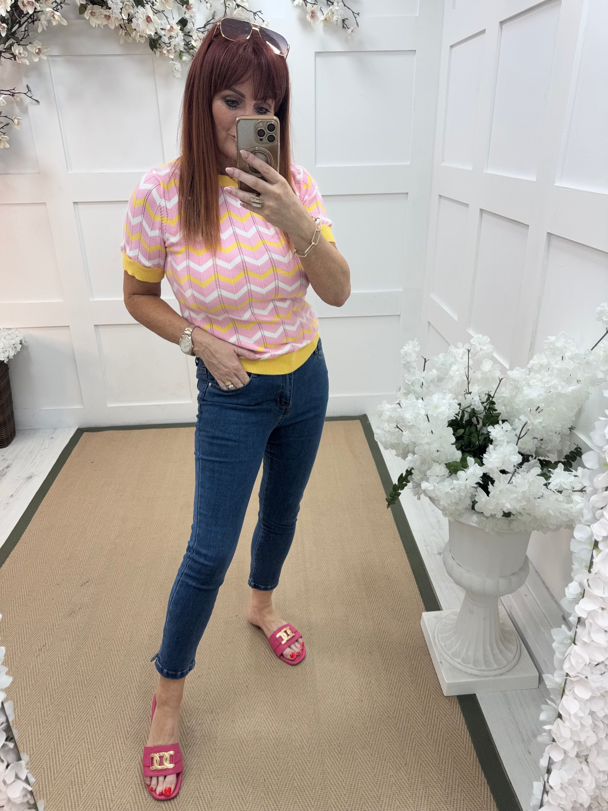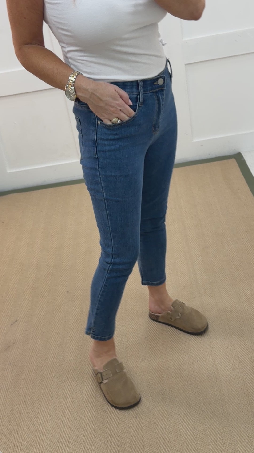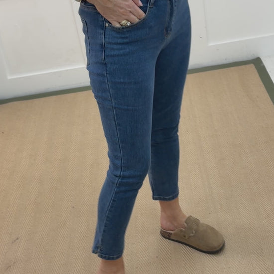 These mid-wash blue jeans feature a slim straight-leg fit with a flattering mid-rise waist. Designed with classic five-pocket styling and a zip fly closure, they offer a clean, timeless look. Subtle fading adds dimension, while the versatile cut makes them perfect for both casual outfits and elevated everyday styling.