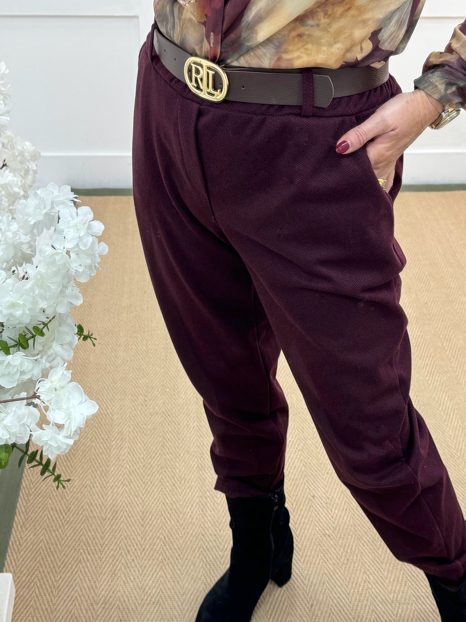 These tailored trousers feature a deep burgundy hue with a softly tapered leg, exuding sophisticated comfort. Styled with sleek black suede ankle boots, they’re paired with a chic brown belt showcasing a bold gold RL buckle. The combination delivers a polished, fashion-forward look with rich autumnal tones and understated luxury.