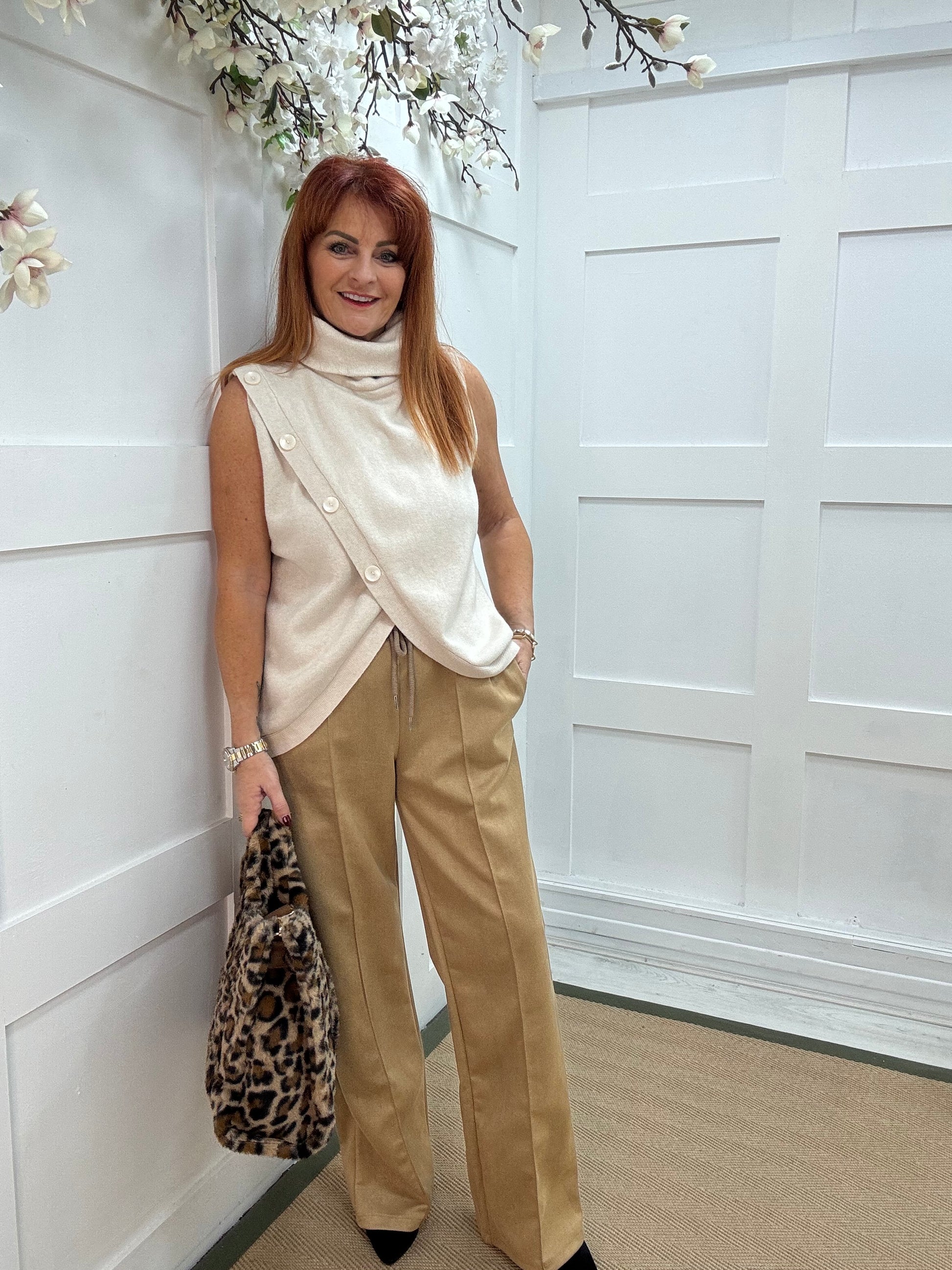 Sadie: Sand suedette wide leg pocket trousers. One size: 10-16