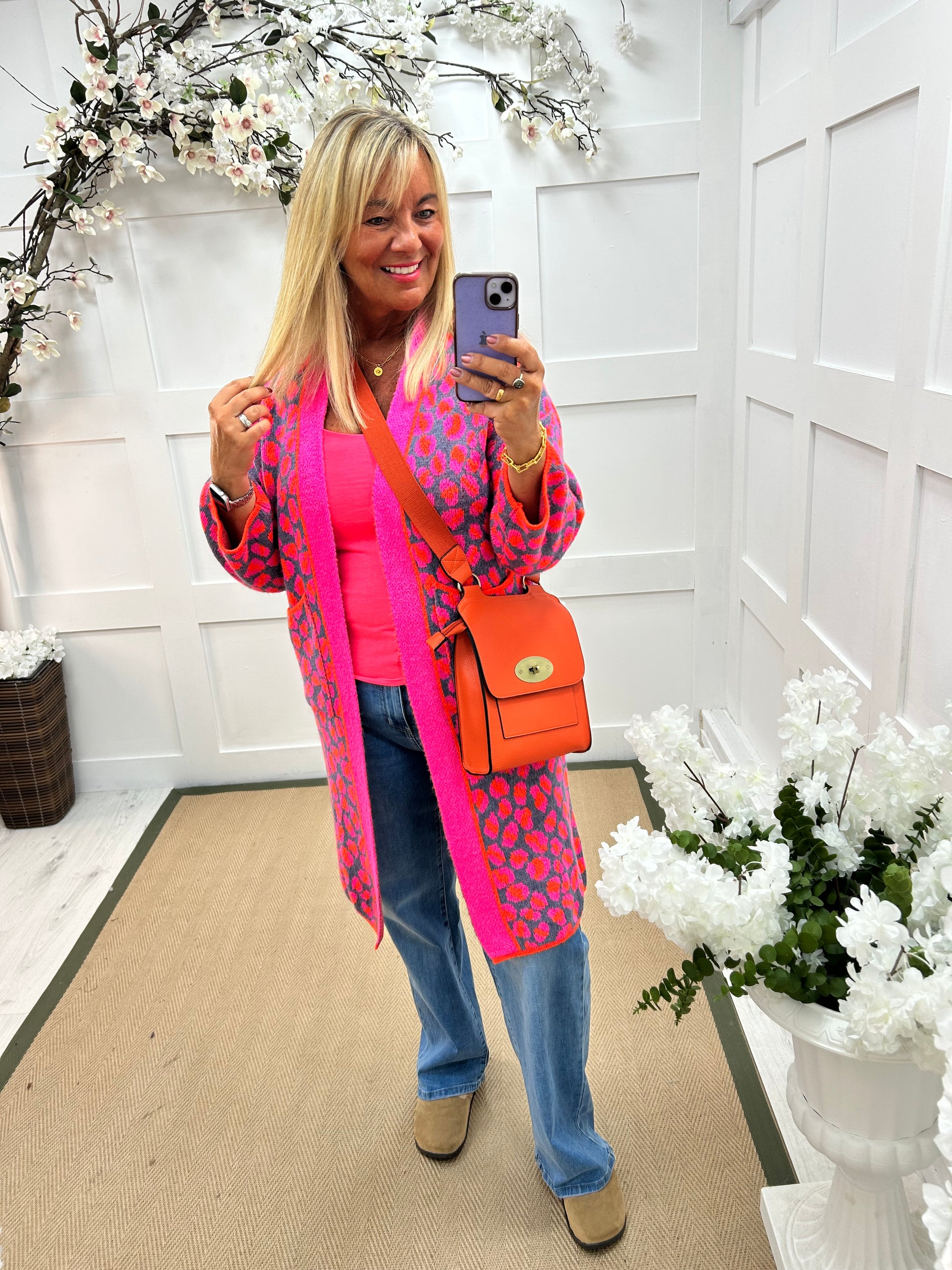 This long, stretchy wool cardigan is a bold statement piece featuring a neon pink and blue leopard pattern against an earthy khaki base. With cozy front pockets, open-front design, and soft textured knit, it blends comfort with eye-catching style—perfect for layering over casual or chic looks to brighten any outfit.