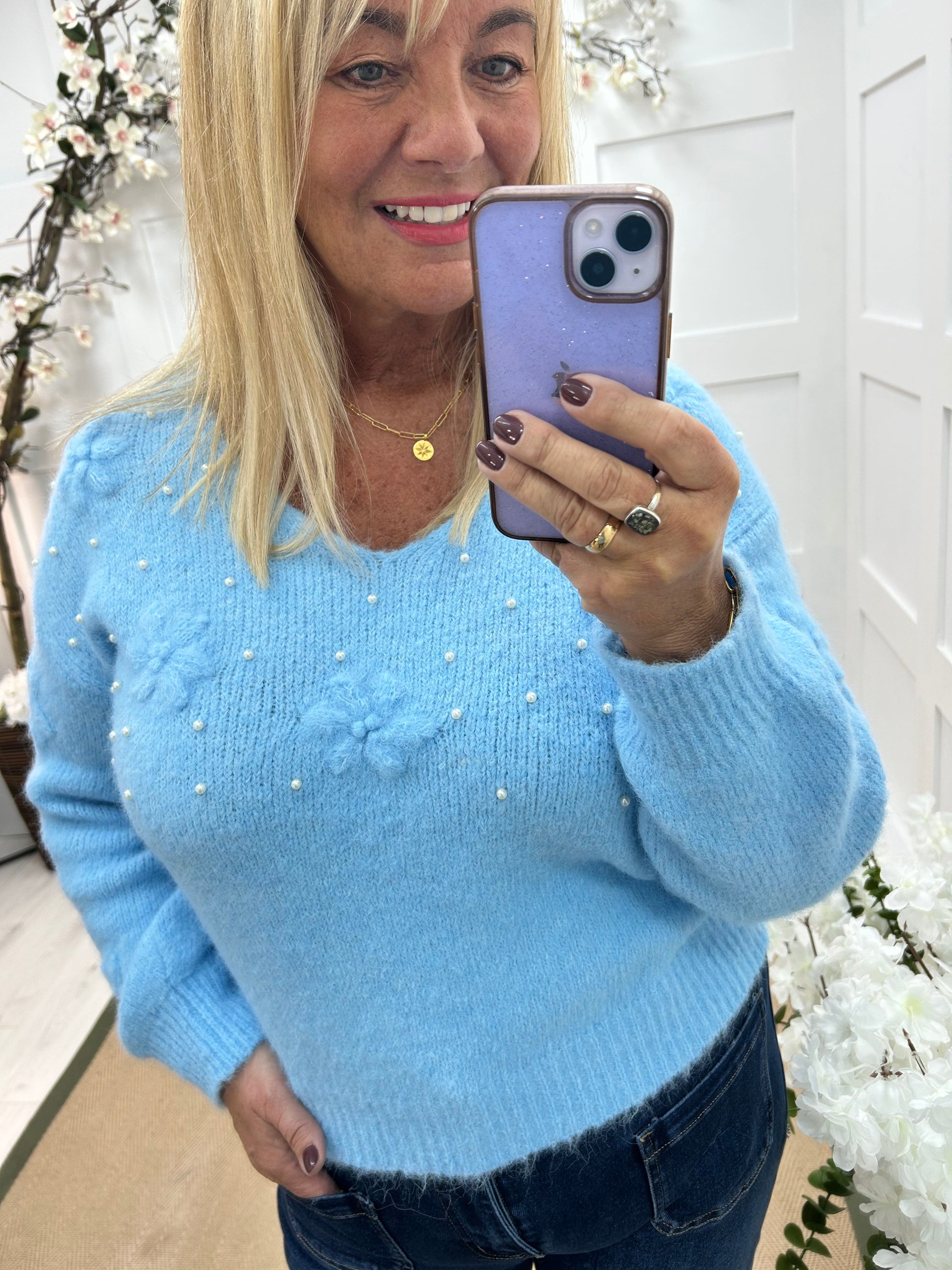 This fine baby blue v-neck pearl knit jumper offers effortless elegance and comfort. Crafted from a lightweight, soft-touch fabric, it pairs beautifully with jeans or our Trudy trousers.
