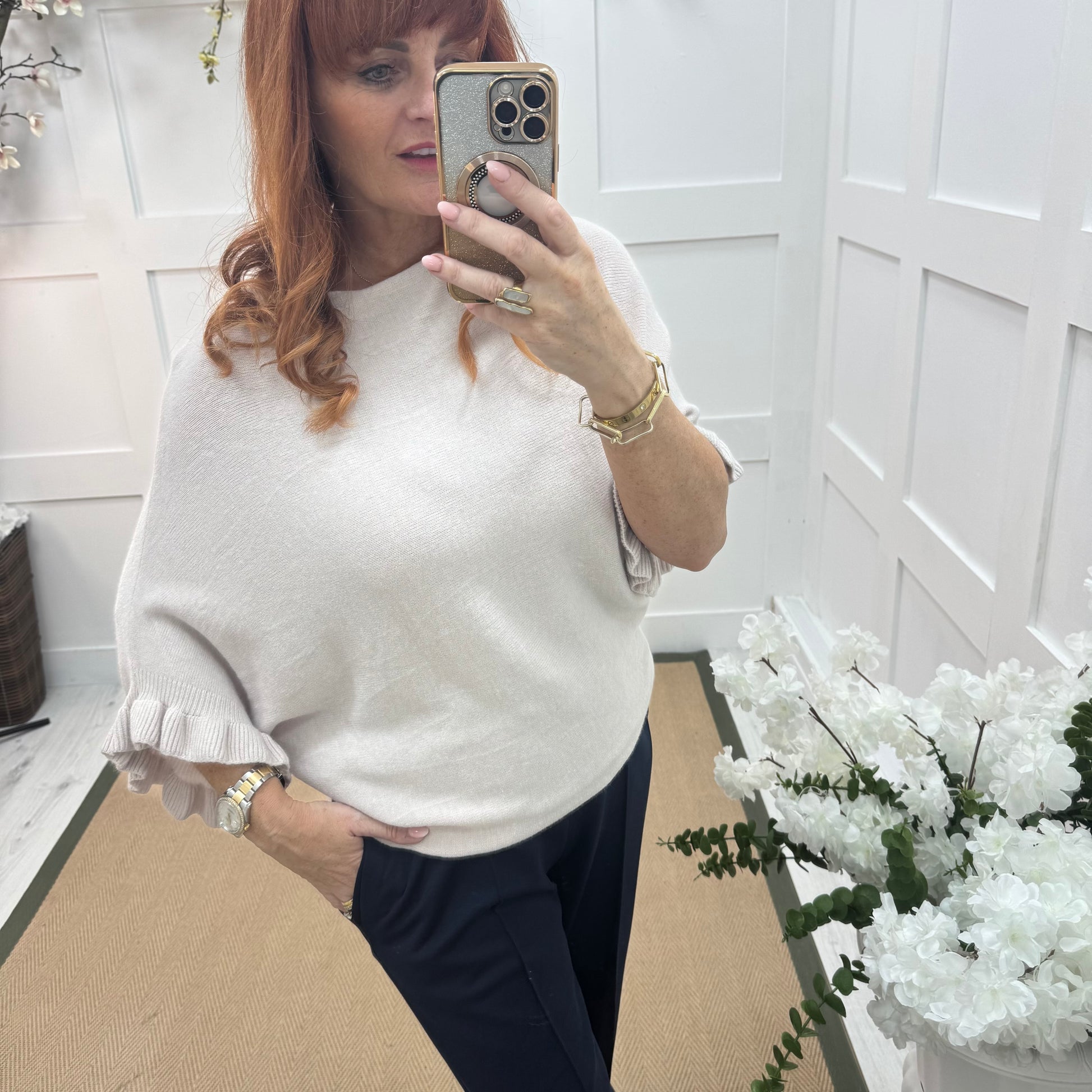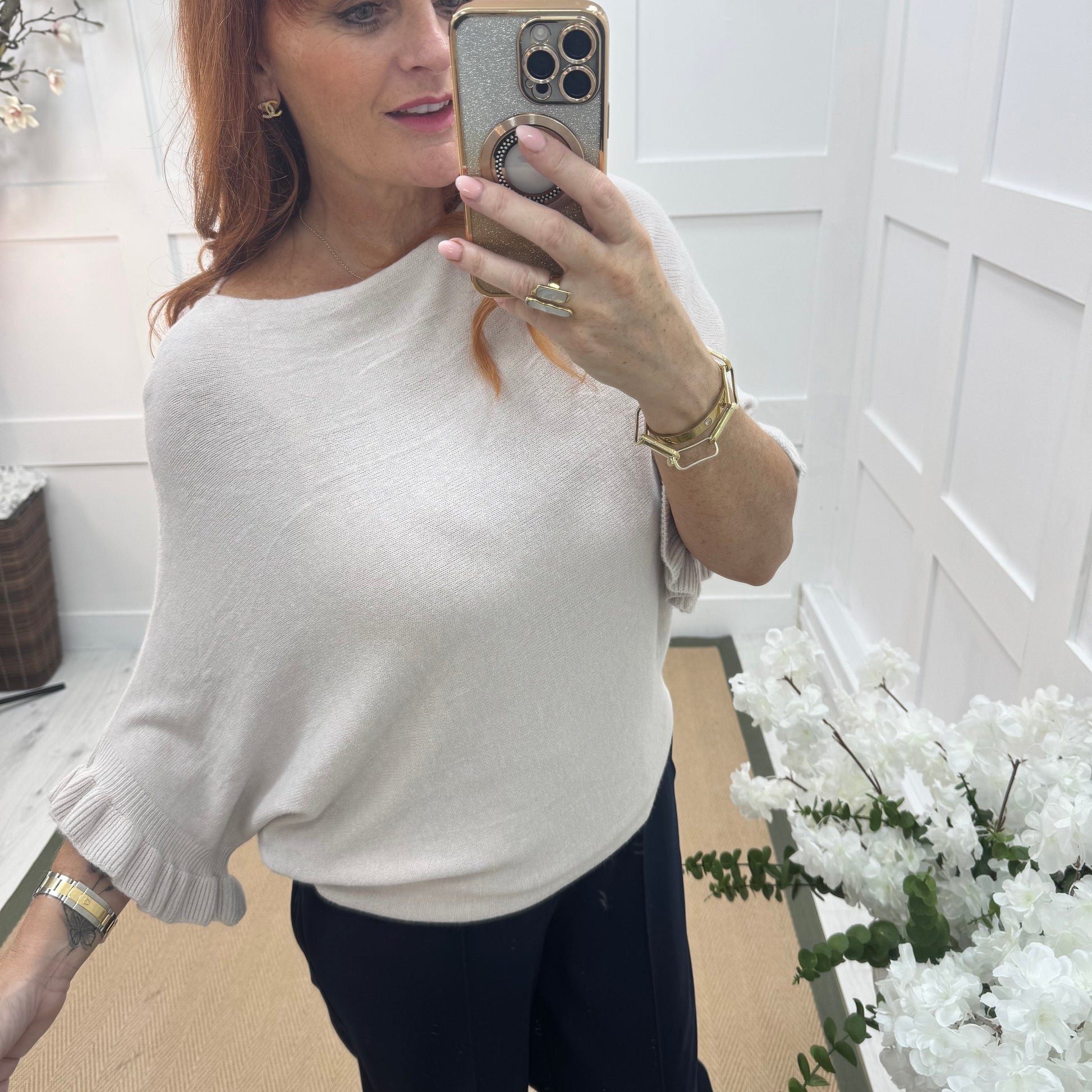 Sierra: Cream batwing fluted sleeve knitted top. One Size 12-18/20