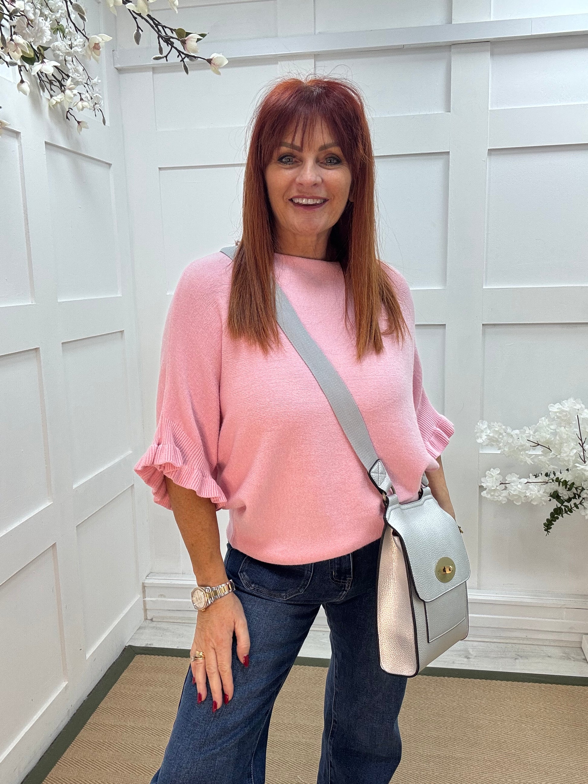 Sierra: Pink batwing fluted sleeve knitted top. One Size 12-18/20