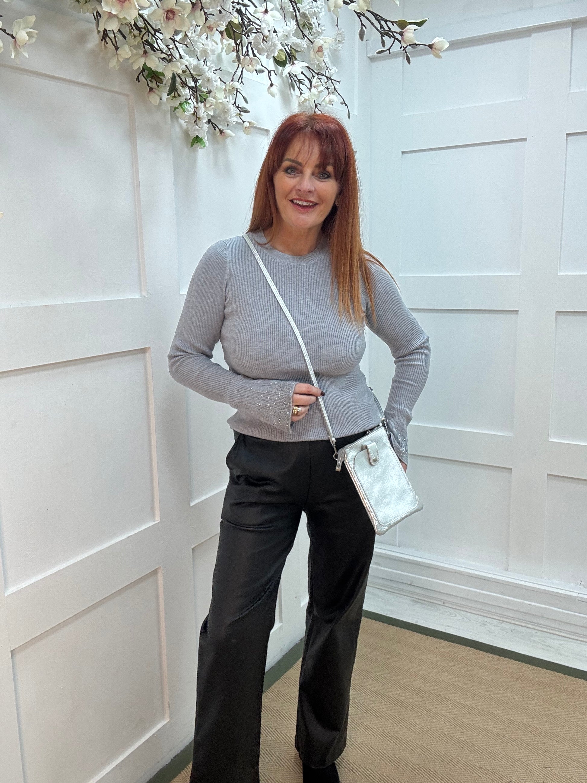 Skylar: Grey ribbed diamanté cuff long sleeve top. Two sizes.