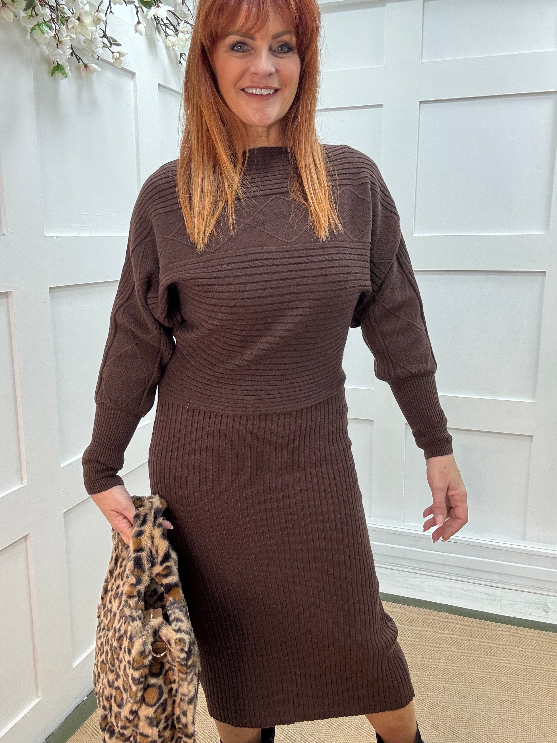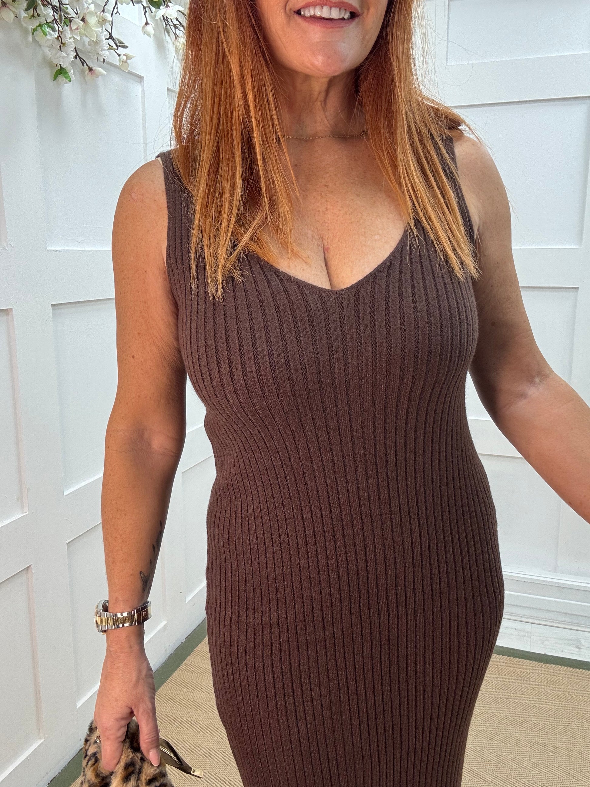 This stylish outfit features a ribbed-knit V-neck sleeveless dress paired with a matching relaxed-fit jumper in rich brown. The soft knit fabric offers comfort and stretch, while the layered look adds effortless elegance. Finished with black boots and a leopard-print faux fur bag, it’s a perfect mix of cosy and chic.