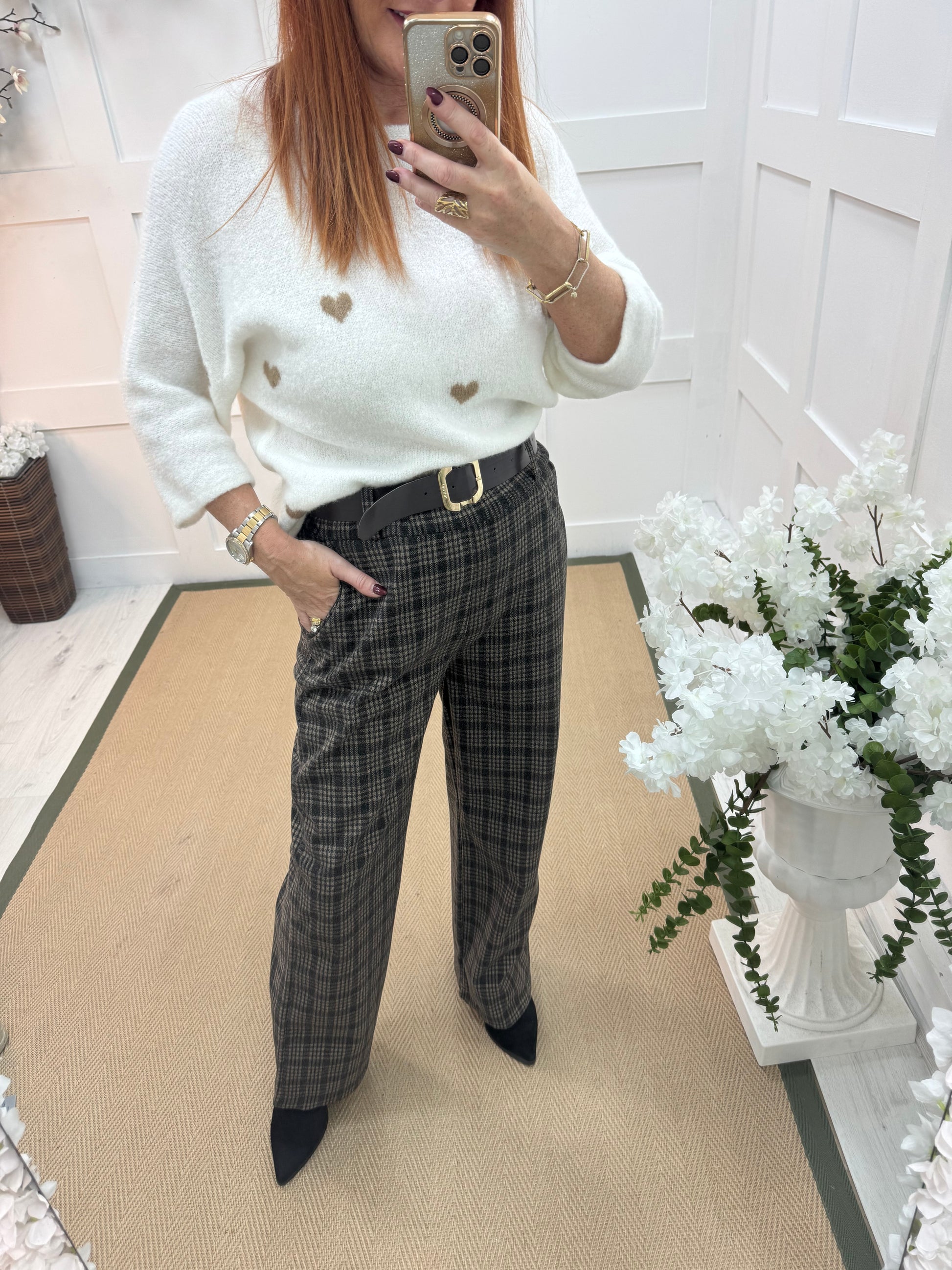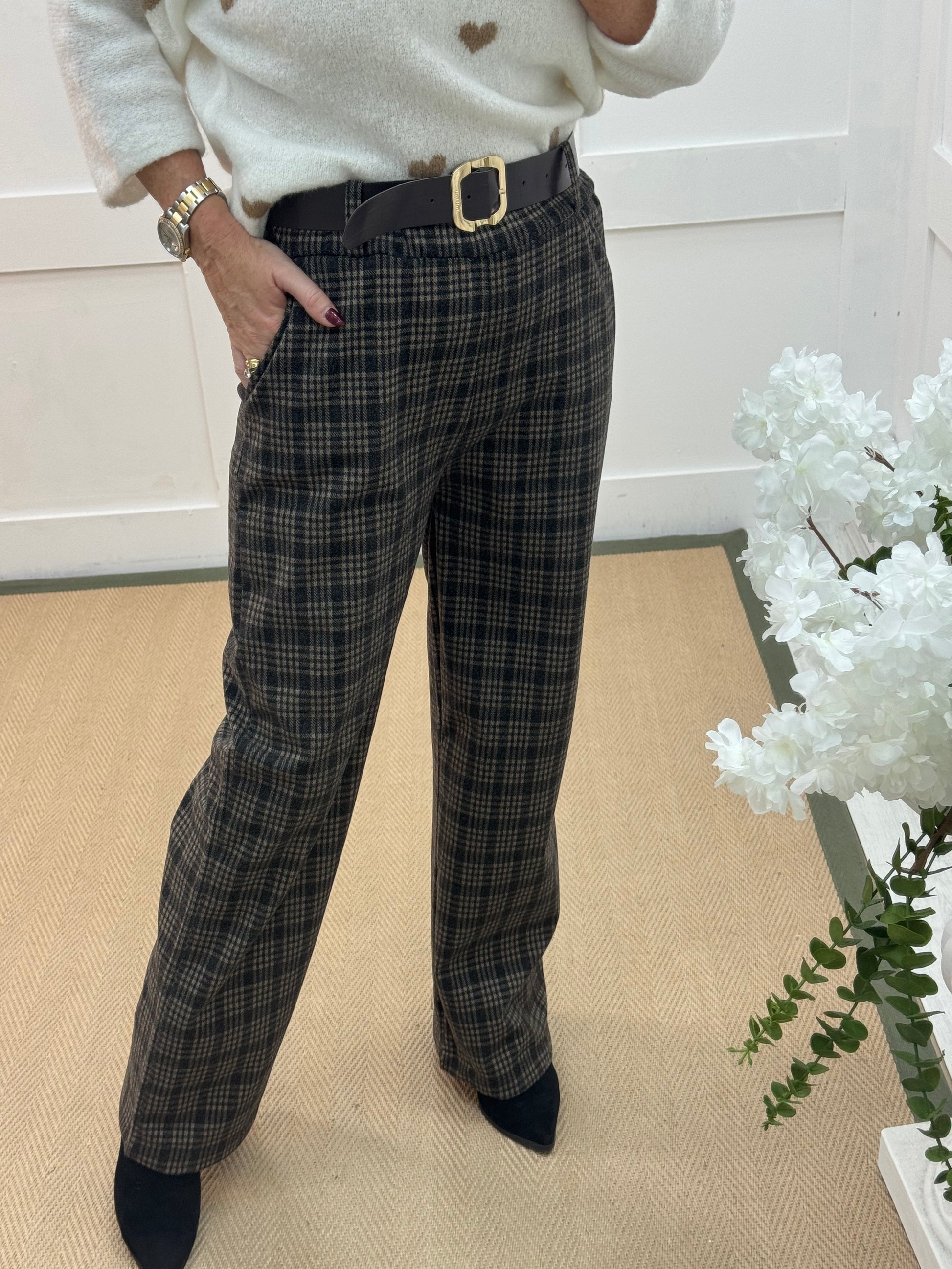 These high-waisted, wide-leg trousers showcase a soft cream and black checkered pattern with an easy elastic waistband. Finished with a sleek brown belt and gold buckle, they balance comfort and sophistication. Perfect for everyday wear or the office, they offer a timeless, versatile style that pairs effortlessly with many outfits.