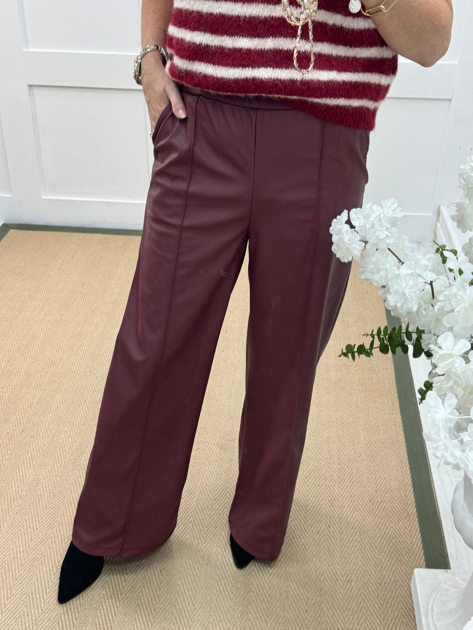 Tabatha: Burgundy faux leather trousers. One size: 12-16