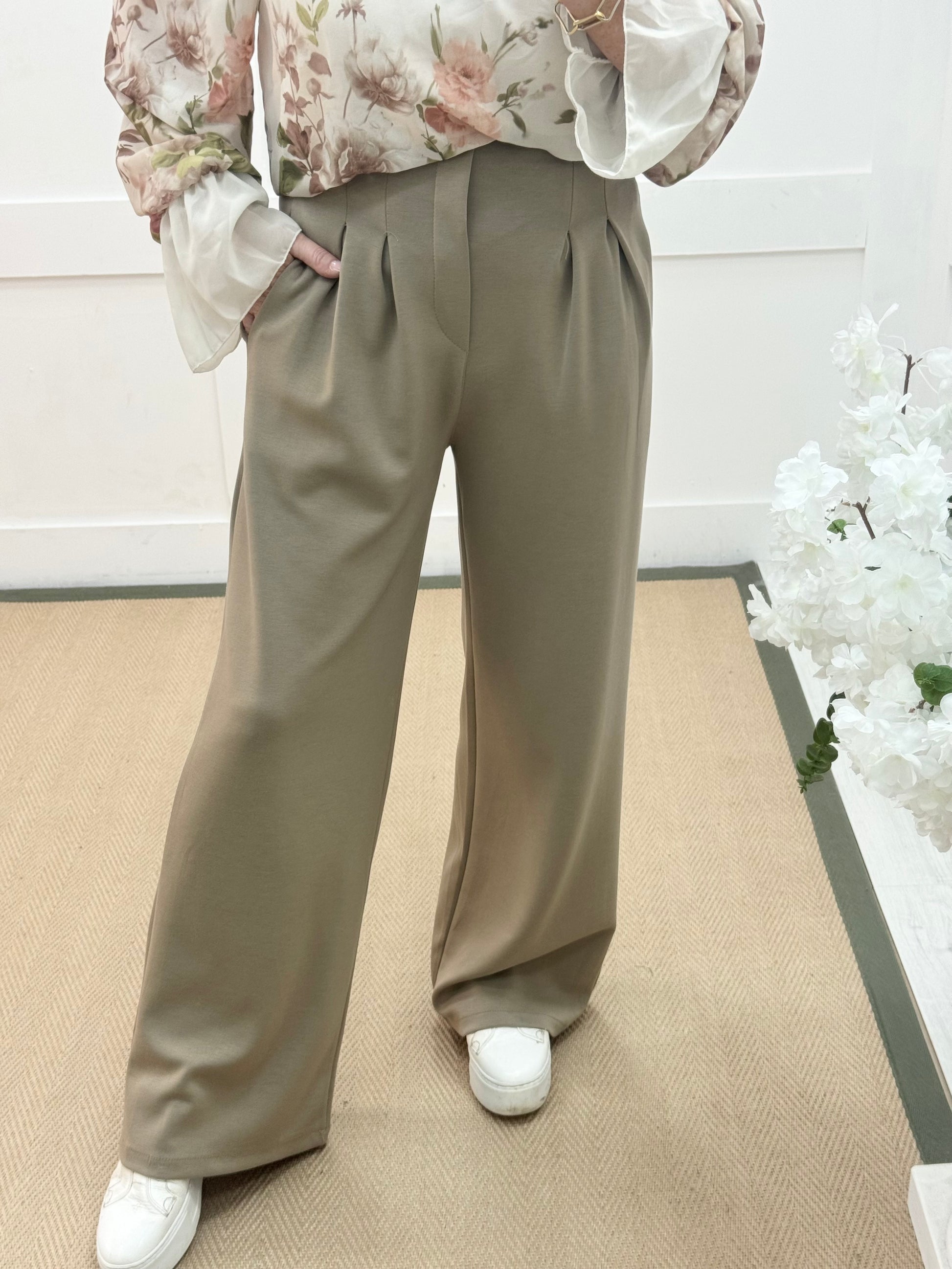 These mocha trousers are high-waisted, wide-leg tailored pants designed for a sleek and elongated silhouette. They feature a structured waistband with subtle front pleat detailing, creating a polished, flattering fit. The fabric has a smooth, fluid drape that moves beautifully while maintaining shape. Elegant yet comfortable, they’re perfect for both smart and elevated casual styling.