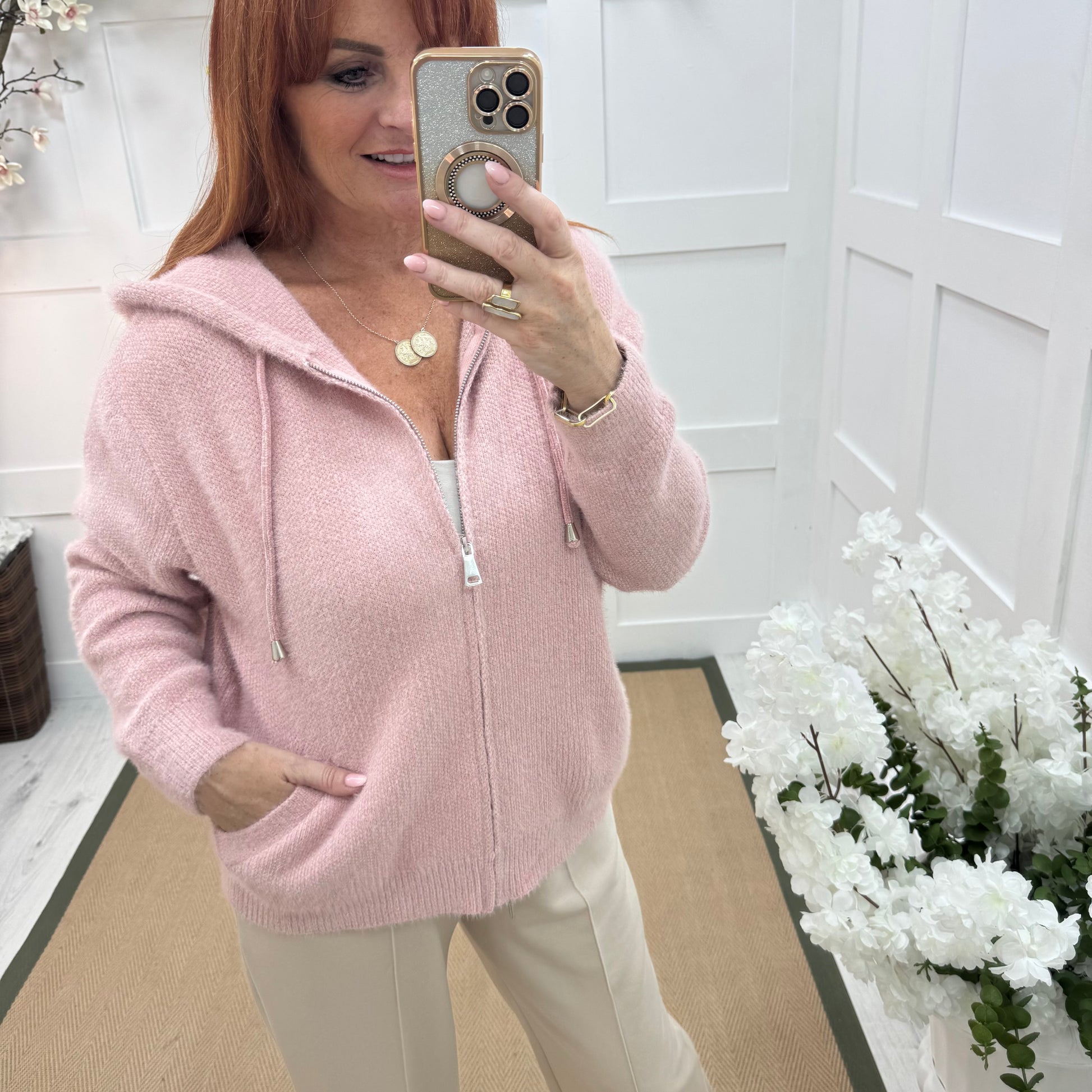 This soft zip-up hoodie comes in a beautiful baby pink shade, offering a relaxed and cozy feel. Designed with a drawstring hood, front zip fastening, and handy side pockets, it’s both practical and stylish. The plush knit texture adds warmth, while the loose fit makes it perfect for layering over casual outfits with ease.