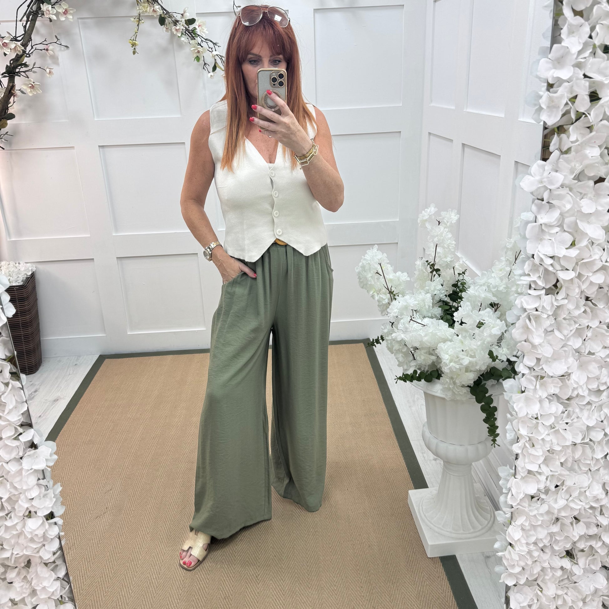 These khaki pocket trousers are wide-legged, and flowy with an elastic waistband. They have a relaxed fit, a subtle texture, and are paired with a woven belt featuring a round buckle. The fabric appears soft and lightweight, making them comfortable and versatile for casual or semi-dressy outfits.