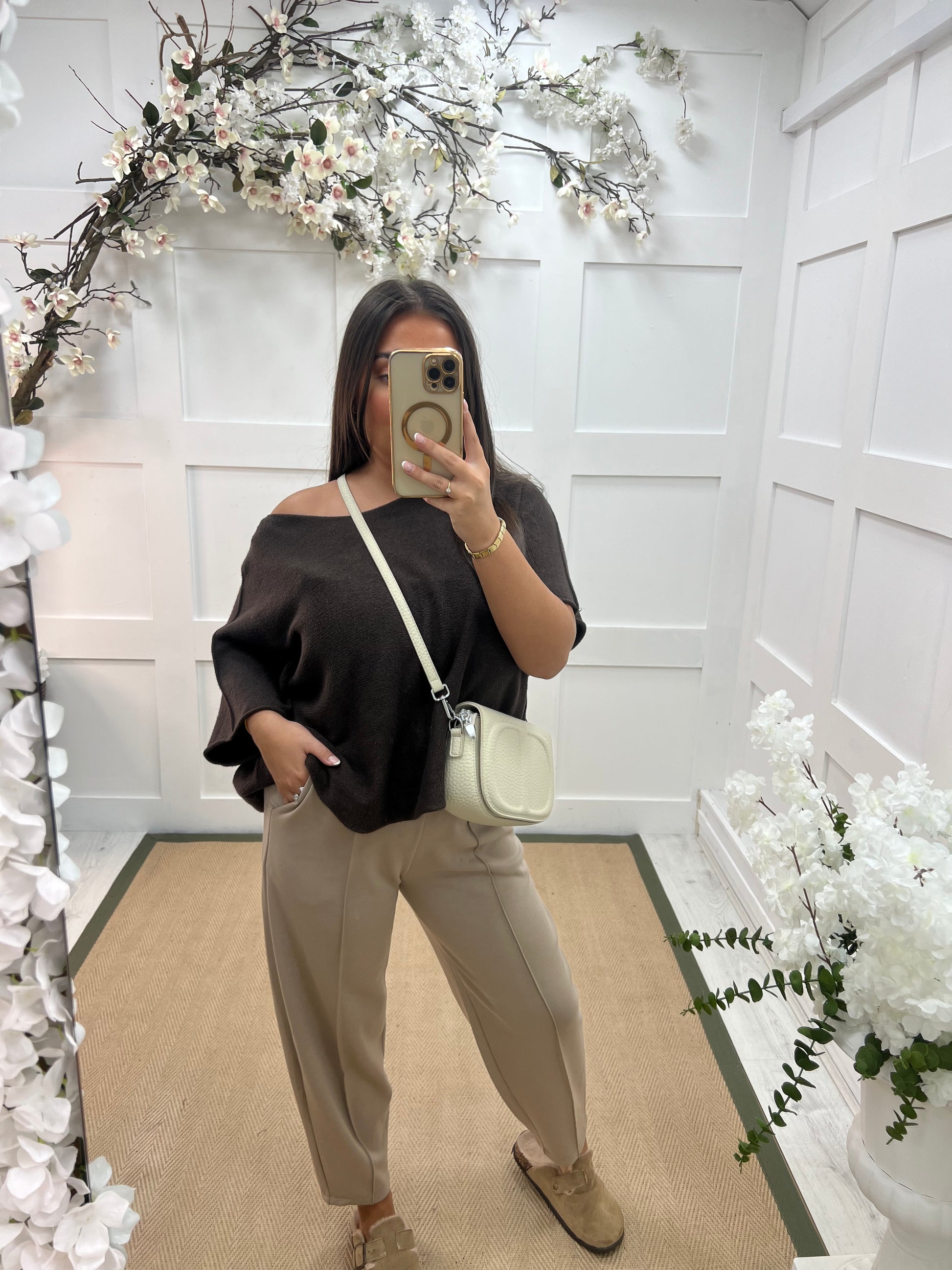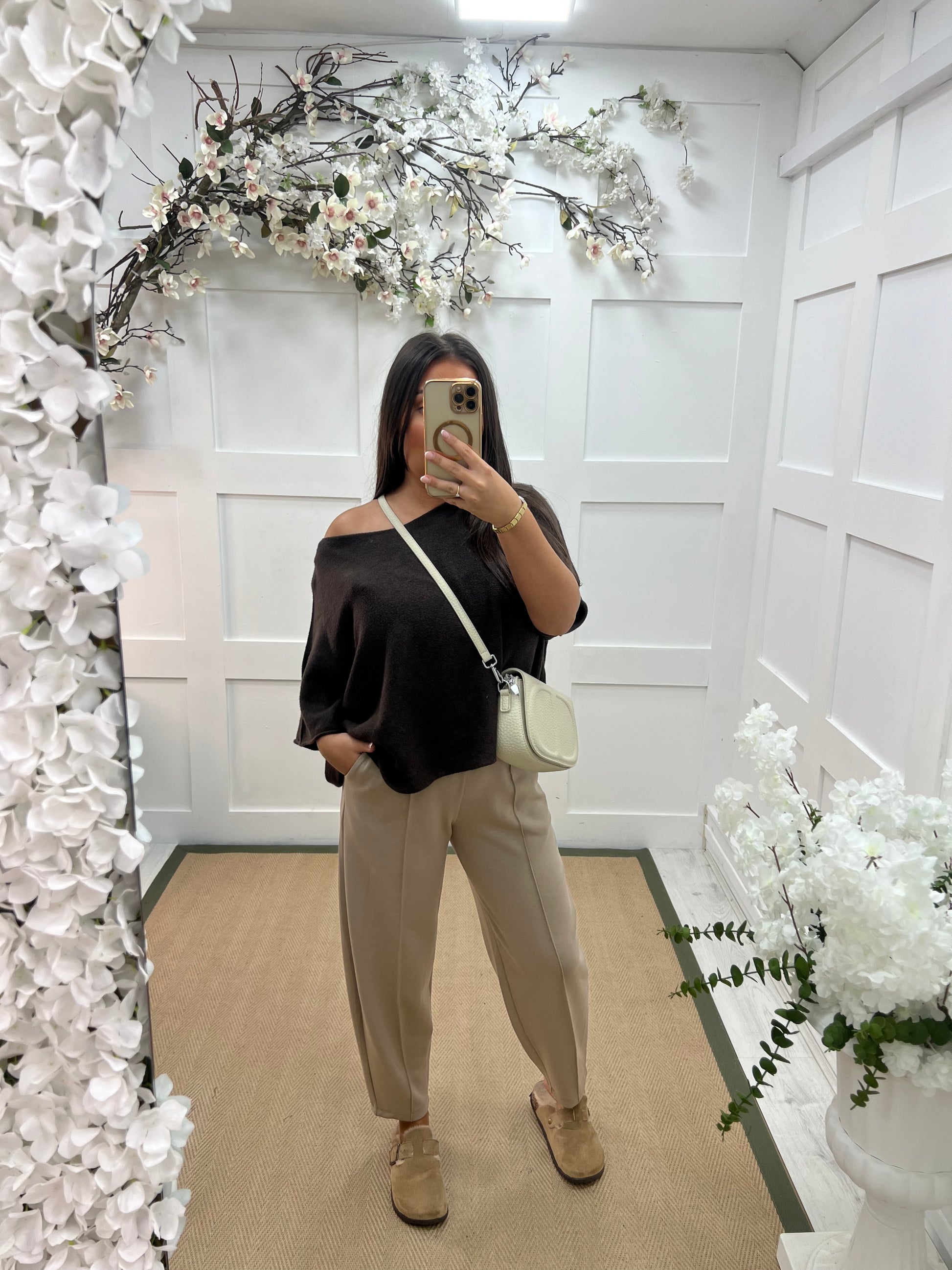 Trinity: Mocha stretchy barrel leg pocket trousers. One size: 10-14