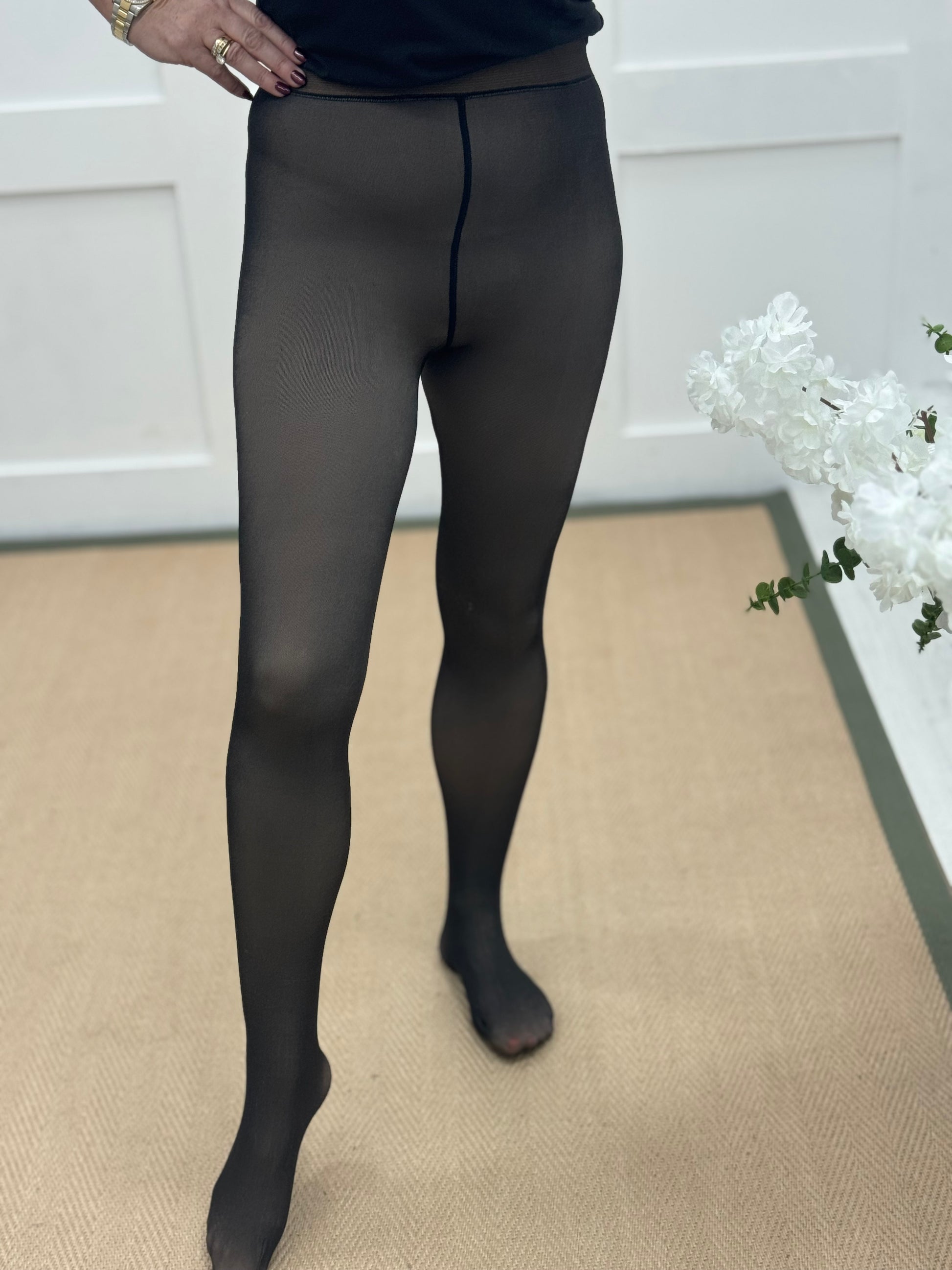 Dark brown high-waisted energy tights are ultra-soft, warm, and super stylish. Featuring thermal lining, they provide a cozy yet breathable fit. The high waistband offers a flattering, secure feel, team up with a cosy knitted jumper dress. Perfect for casual wear, lounging, or layering in winter.