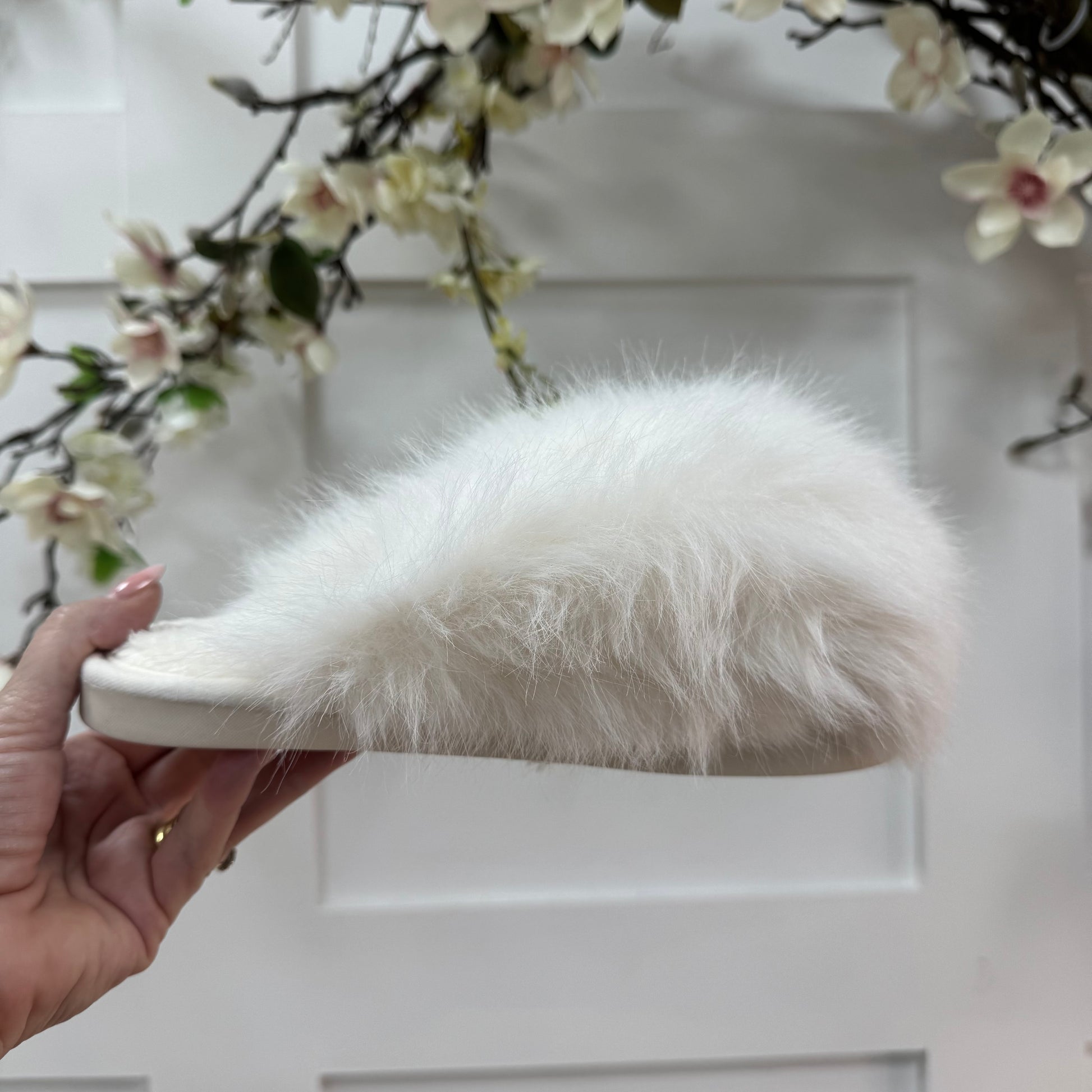 Trixi: White fluffy mule slippers. Sizes: 3-8