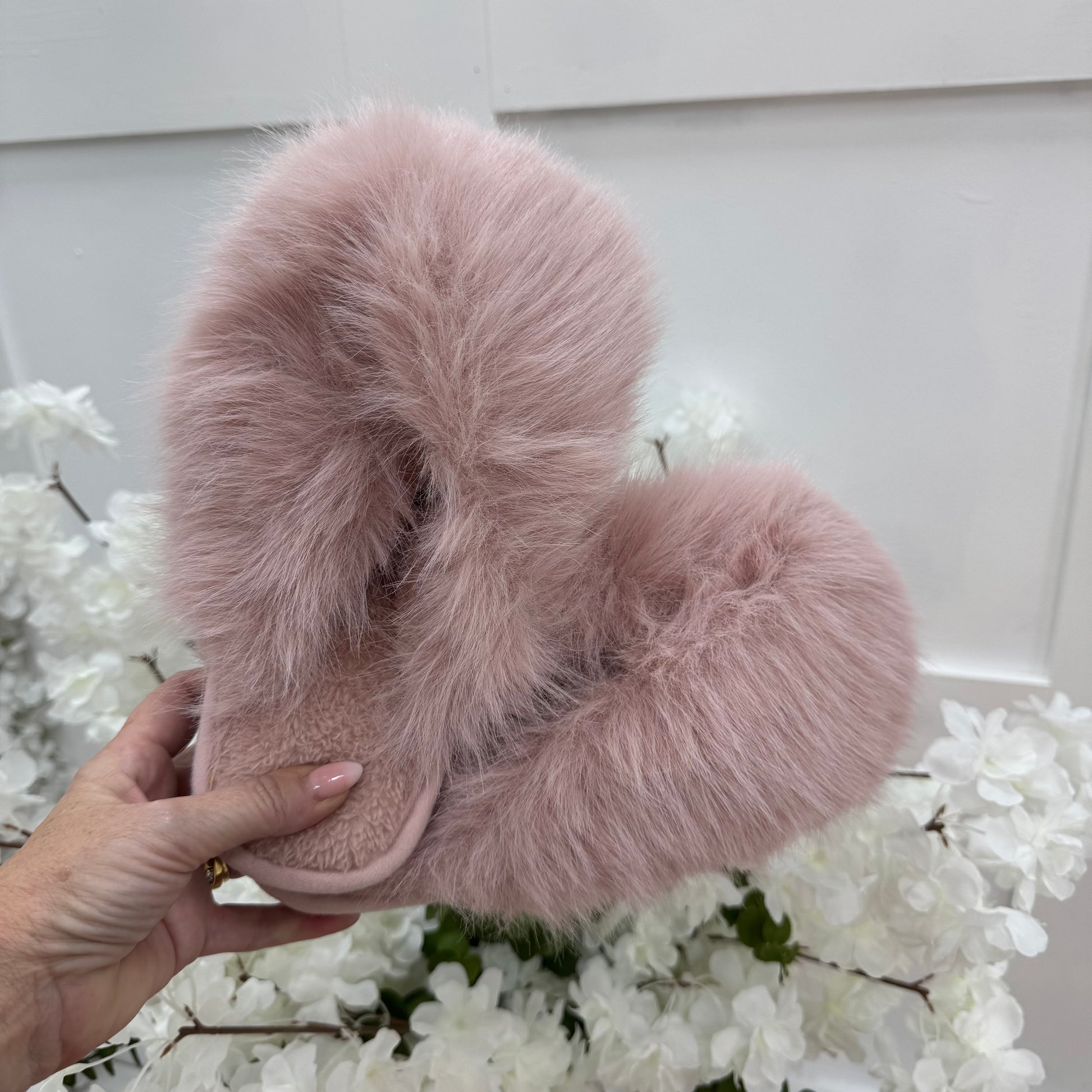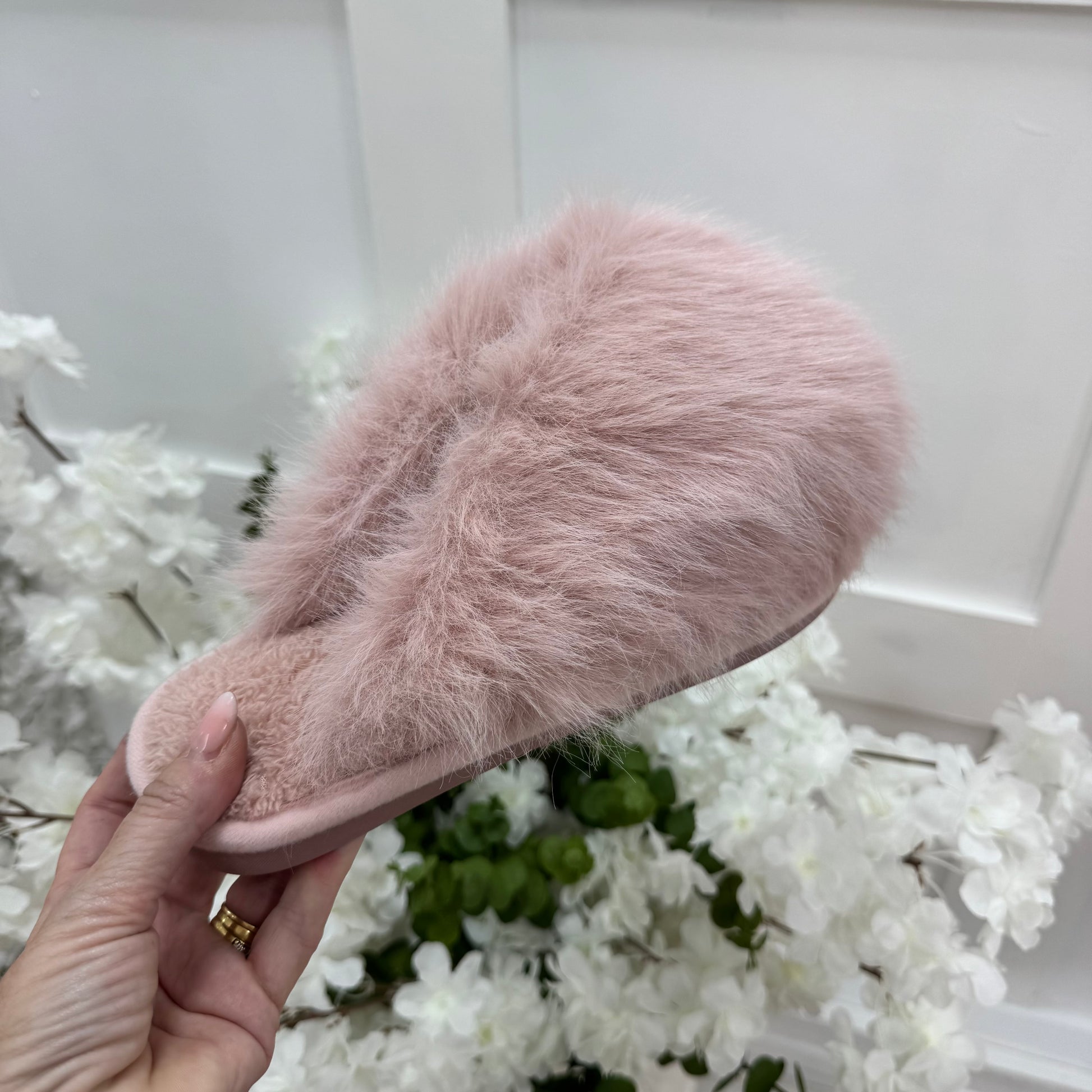 Trixi: Pink fluffy mule slippers. Sizes: 3-8
