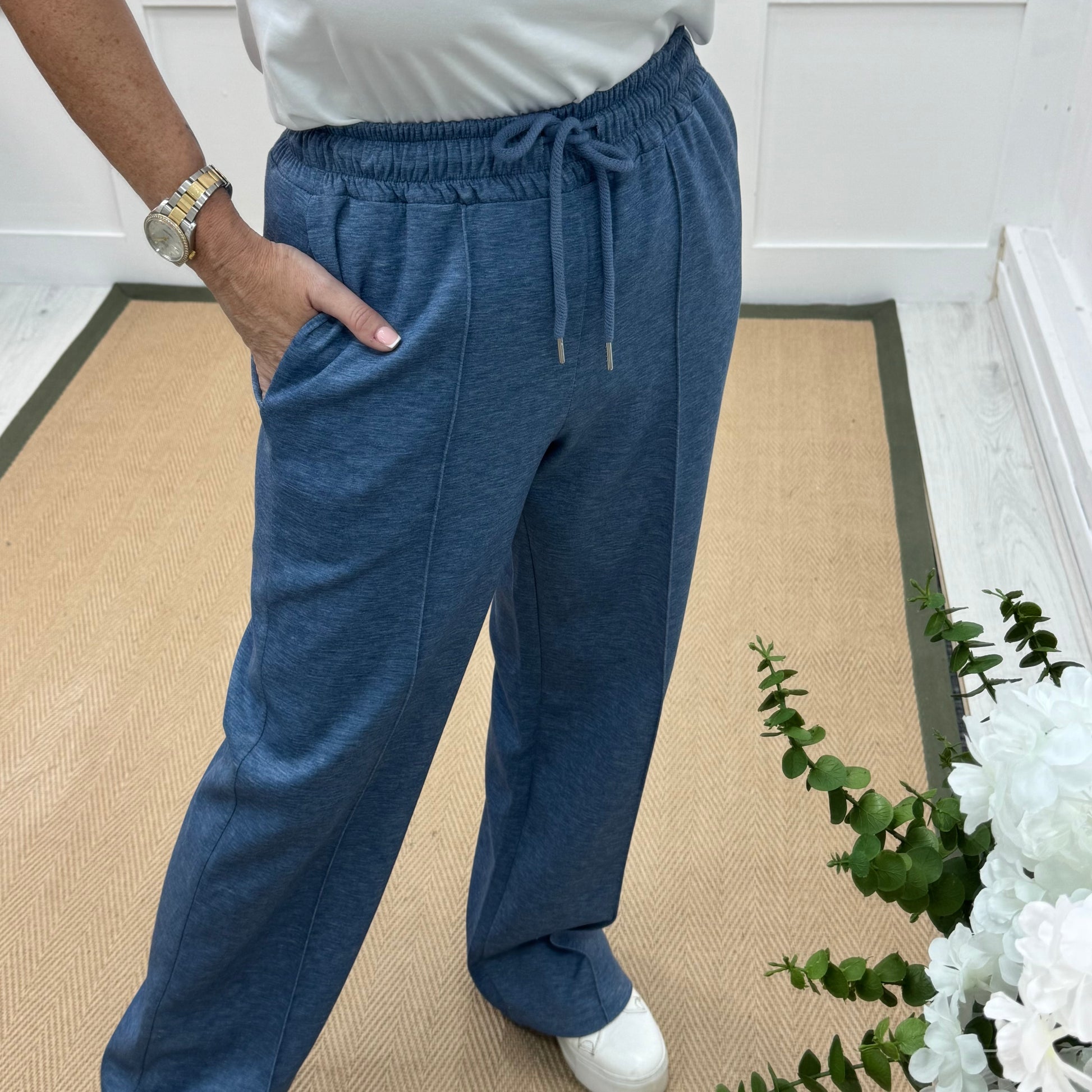 Trudy: Denim blue stretchy wide leg pocket trousers. 2 sizes