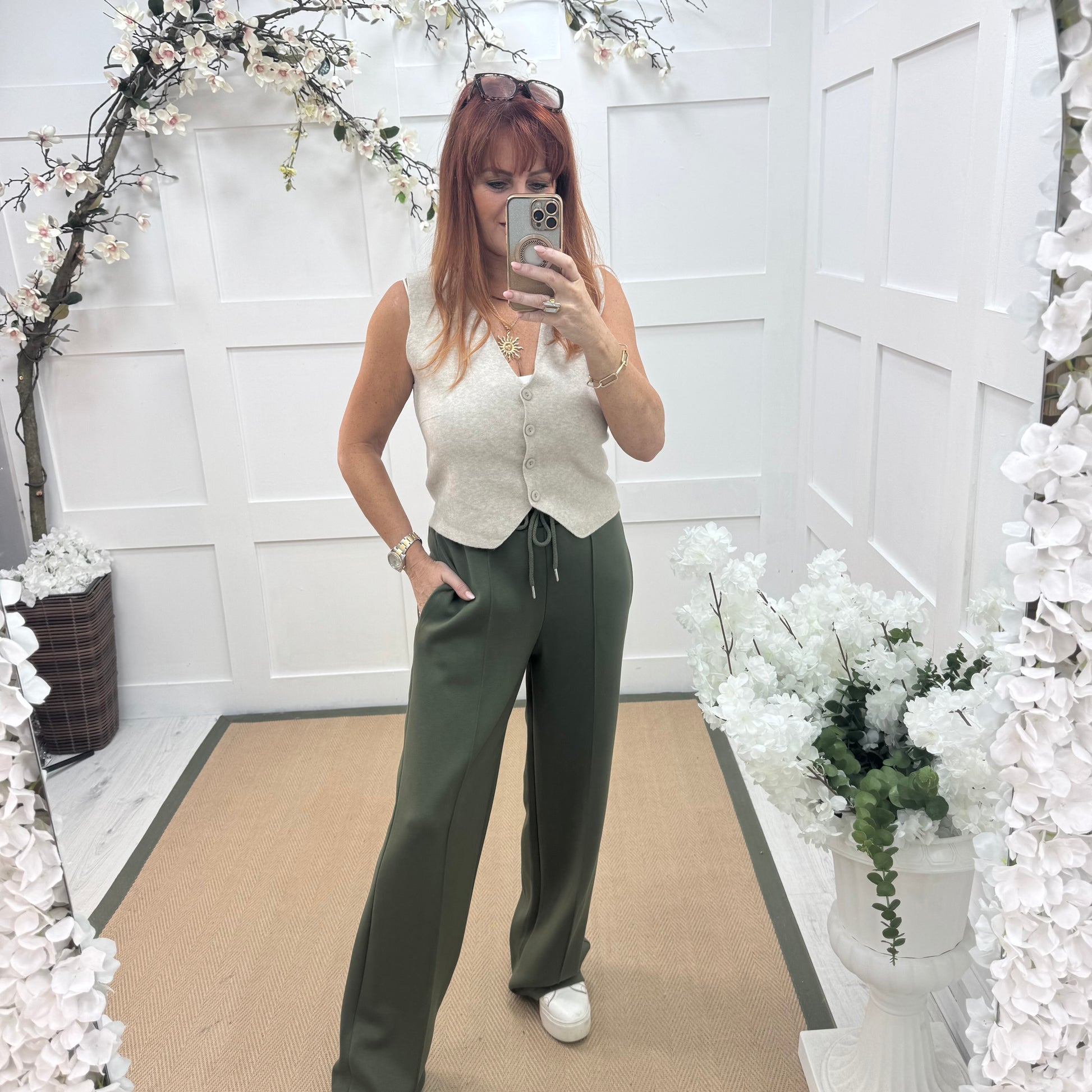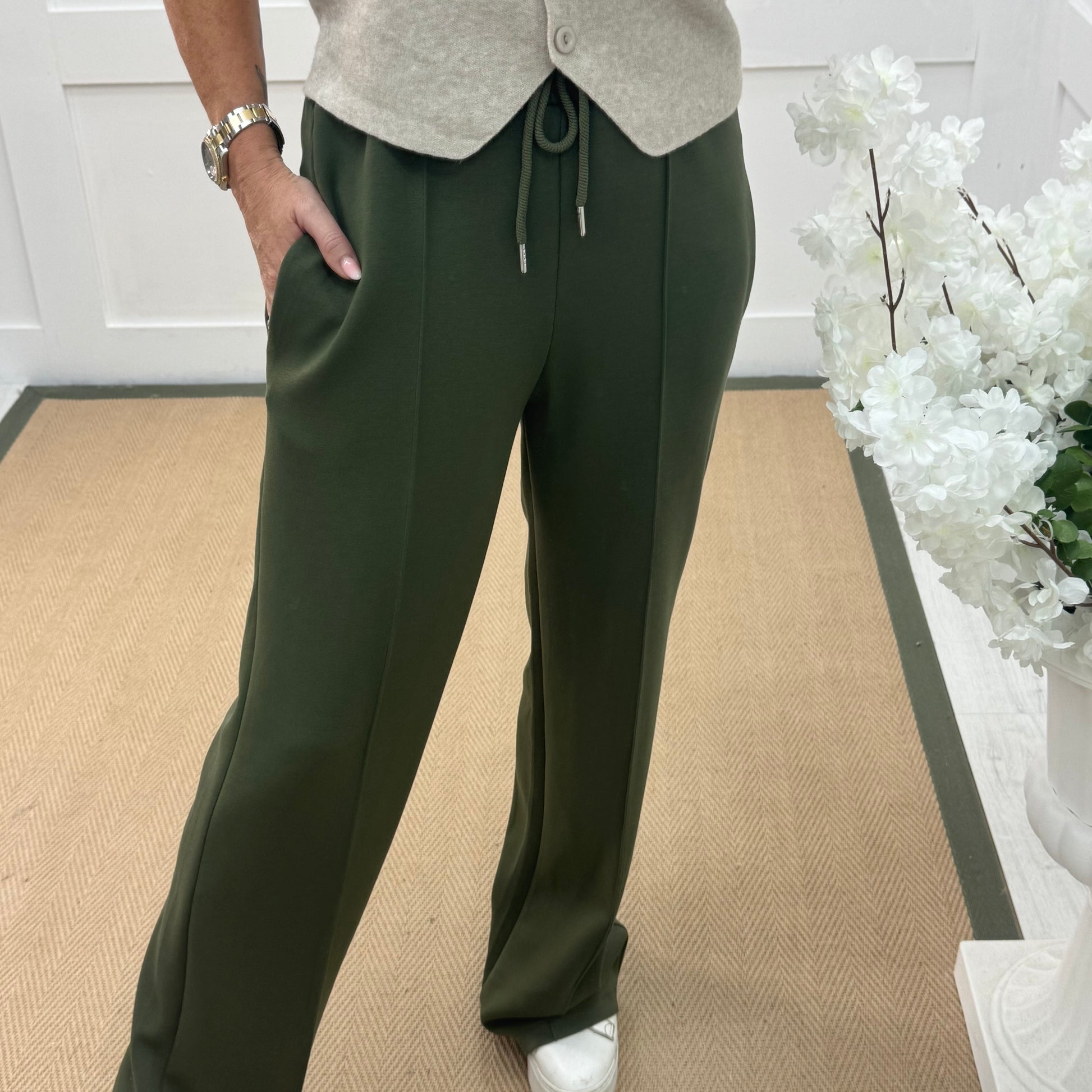 Trudy: Khaki stretchy wide leg pocket trousers. 2 sizes