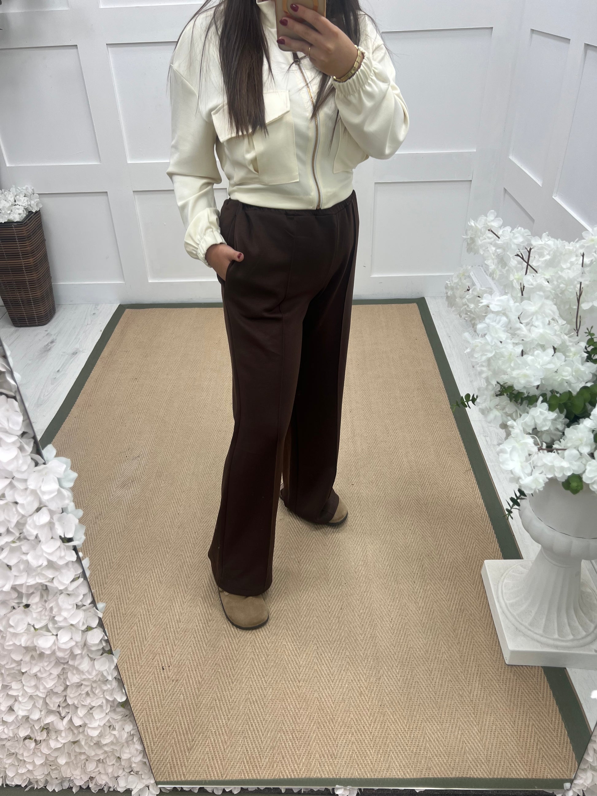Trudy (Short): Brown stretchy wide leg pocket trousers. One size 10-16