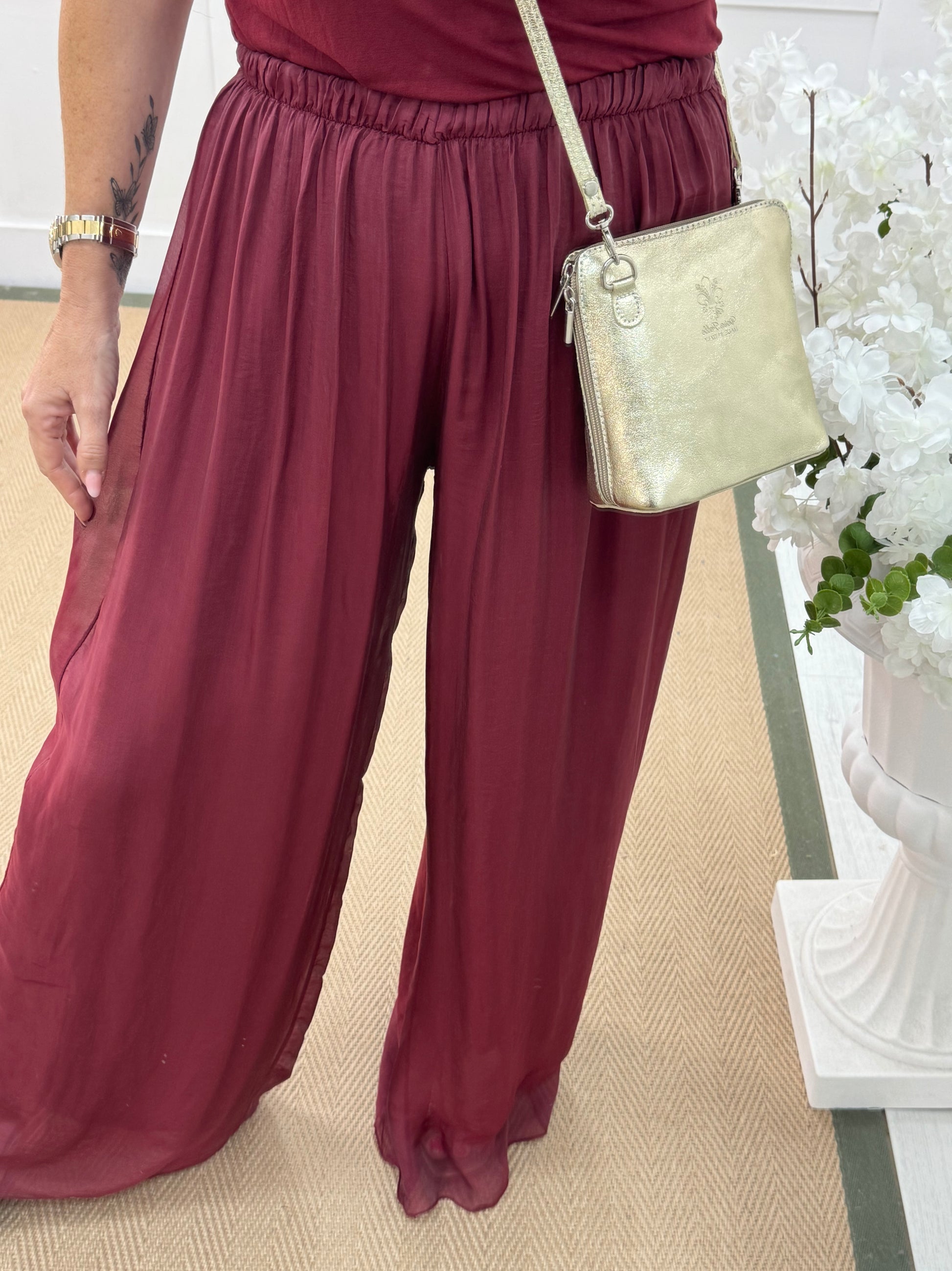 Venice: Burgundy silk wide leg trousers. One size: 12-20