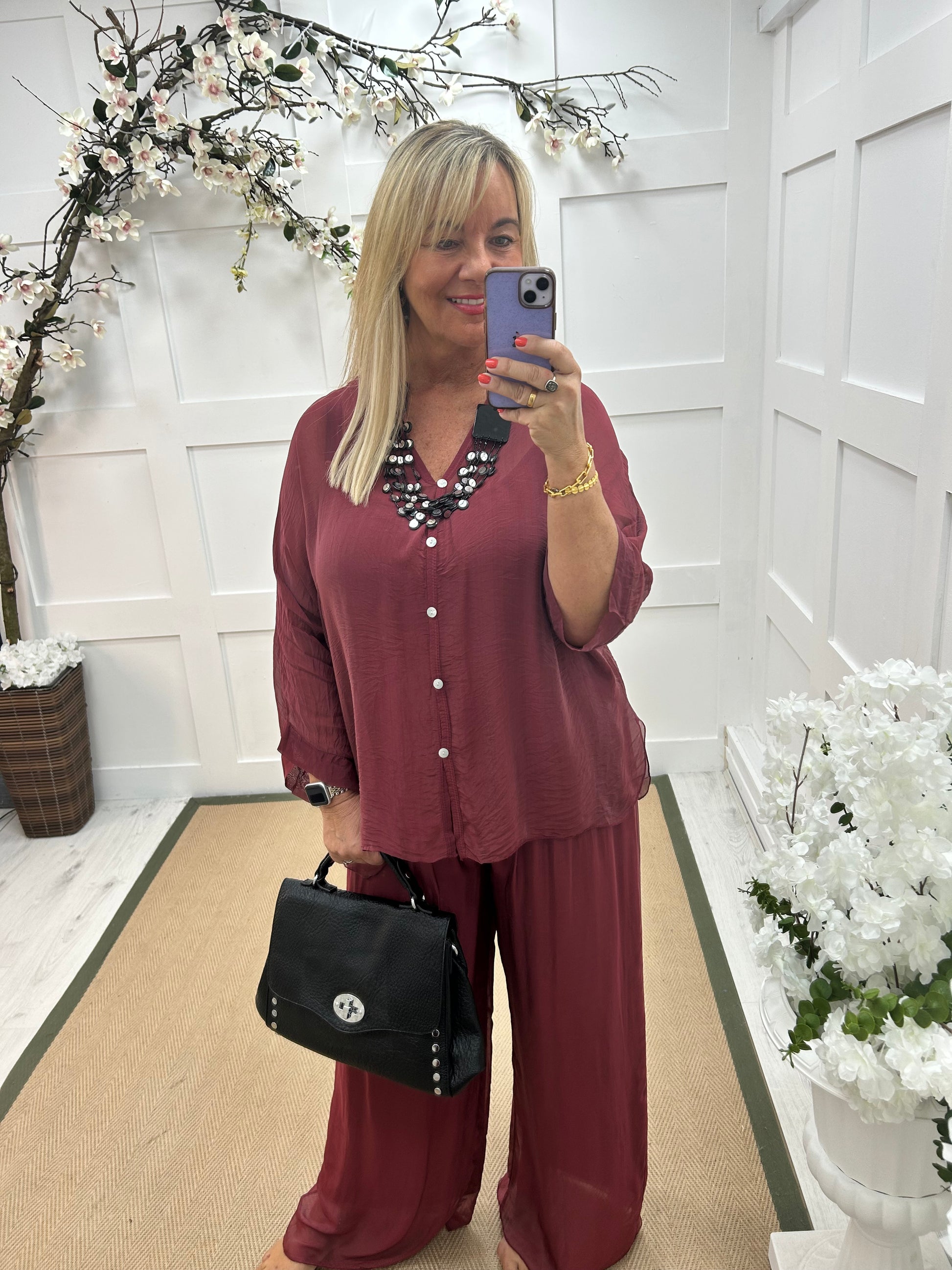 Vienna: Burgundy V neck silk long sleeve top. One size: 12-20