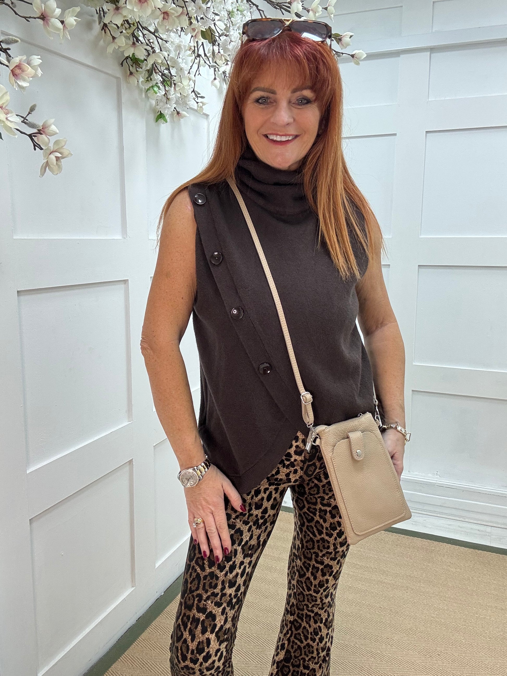 This stretchy knit wrap over top is effortlessly chic with its soft fabric and relaxed fit. Featuring a large button on the wrap over, it blends comfort with understated elegance. Perfect for pairing with Bessie basic top & leather trousers, it’s a versatile piece for both casual and dressy looks.