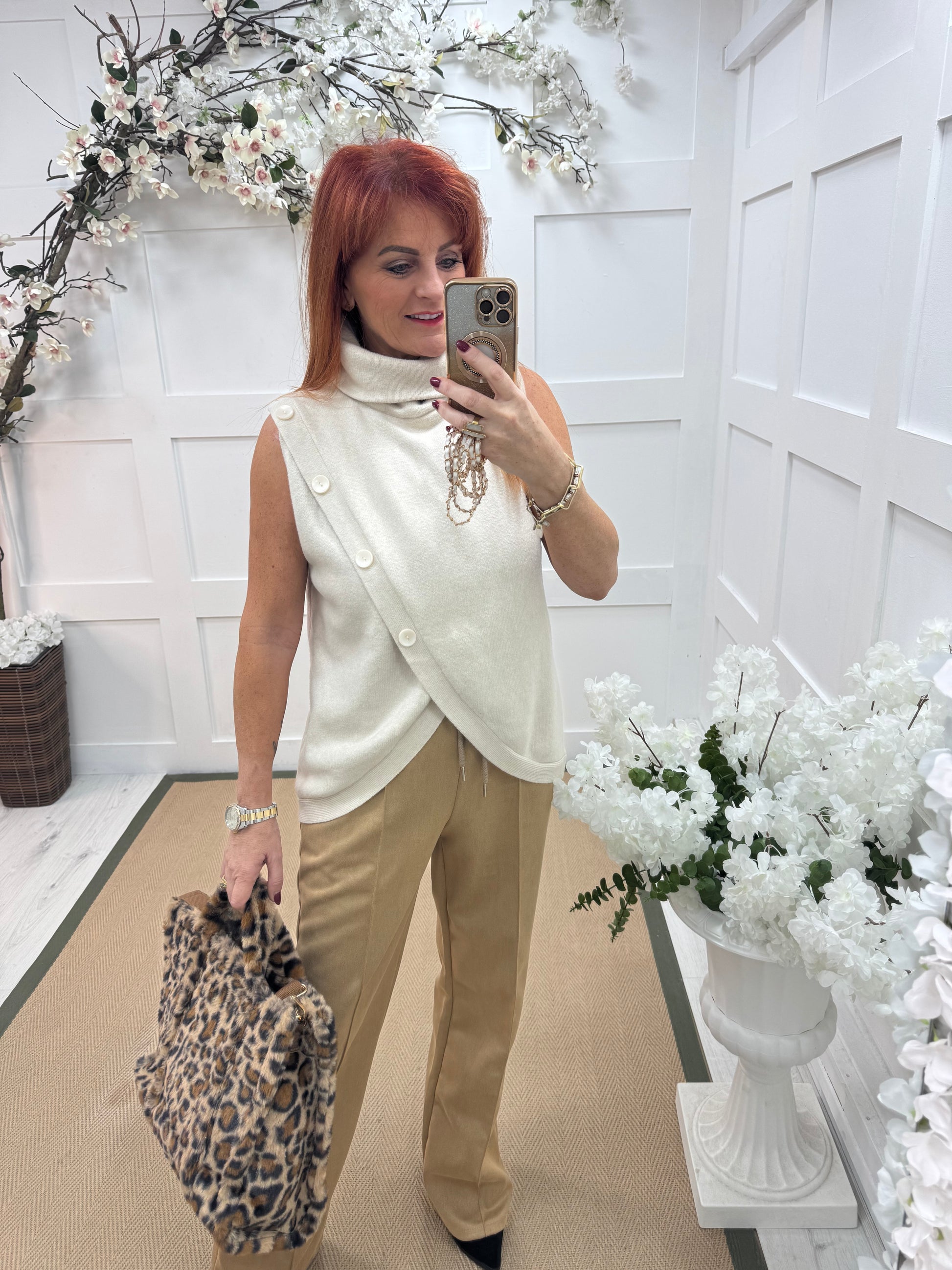Viola: Cream sleeveless cowl neck wrap top. One Sz: 10-16