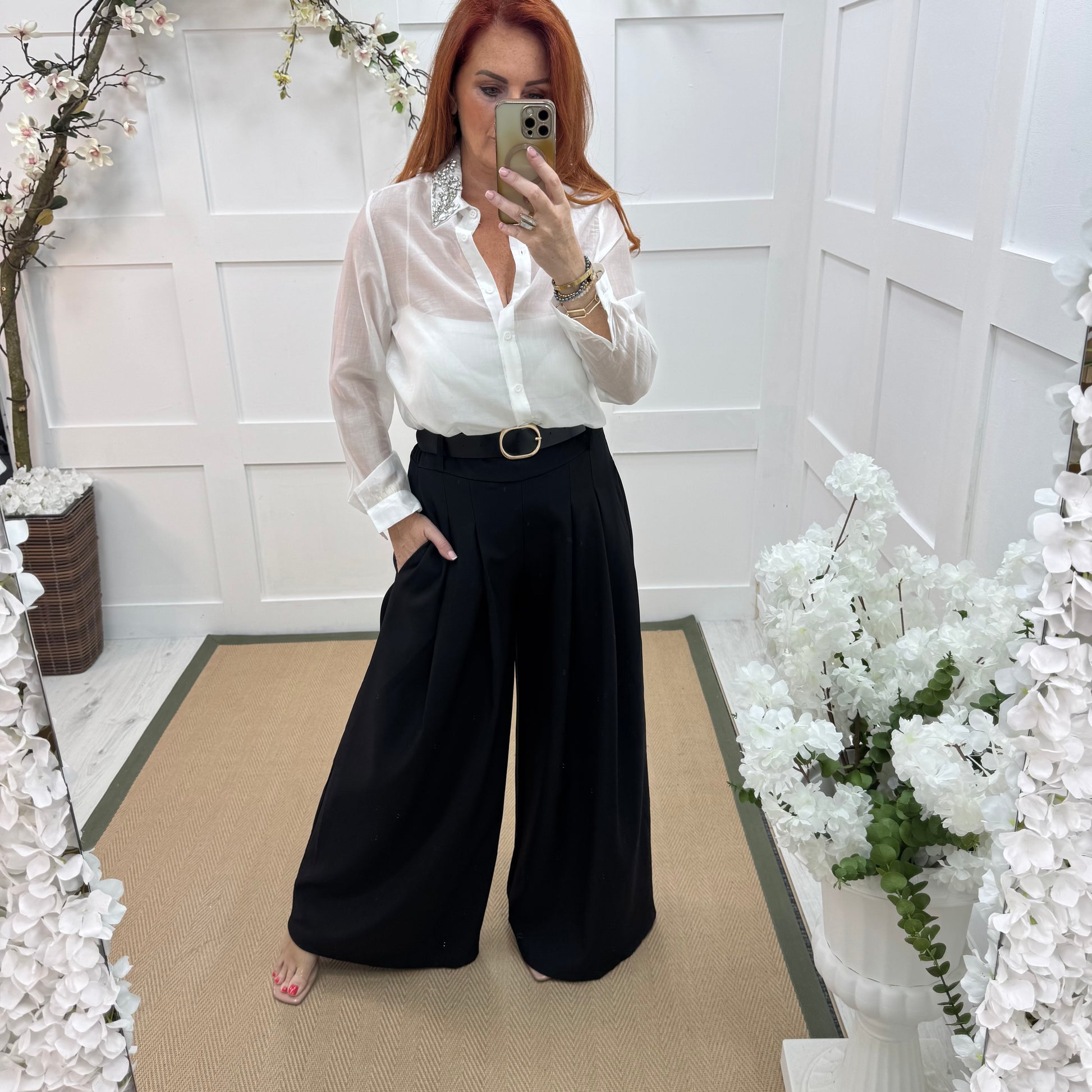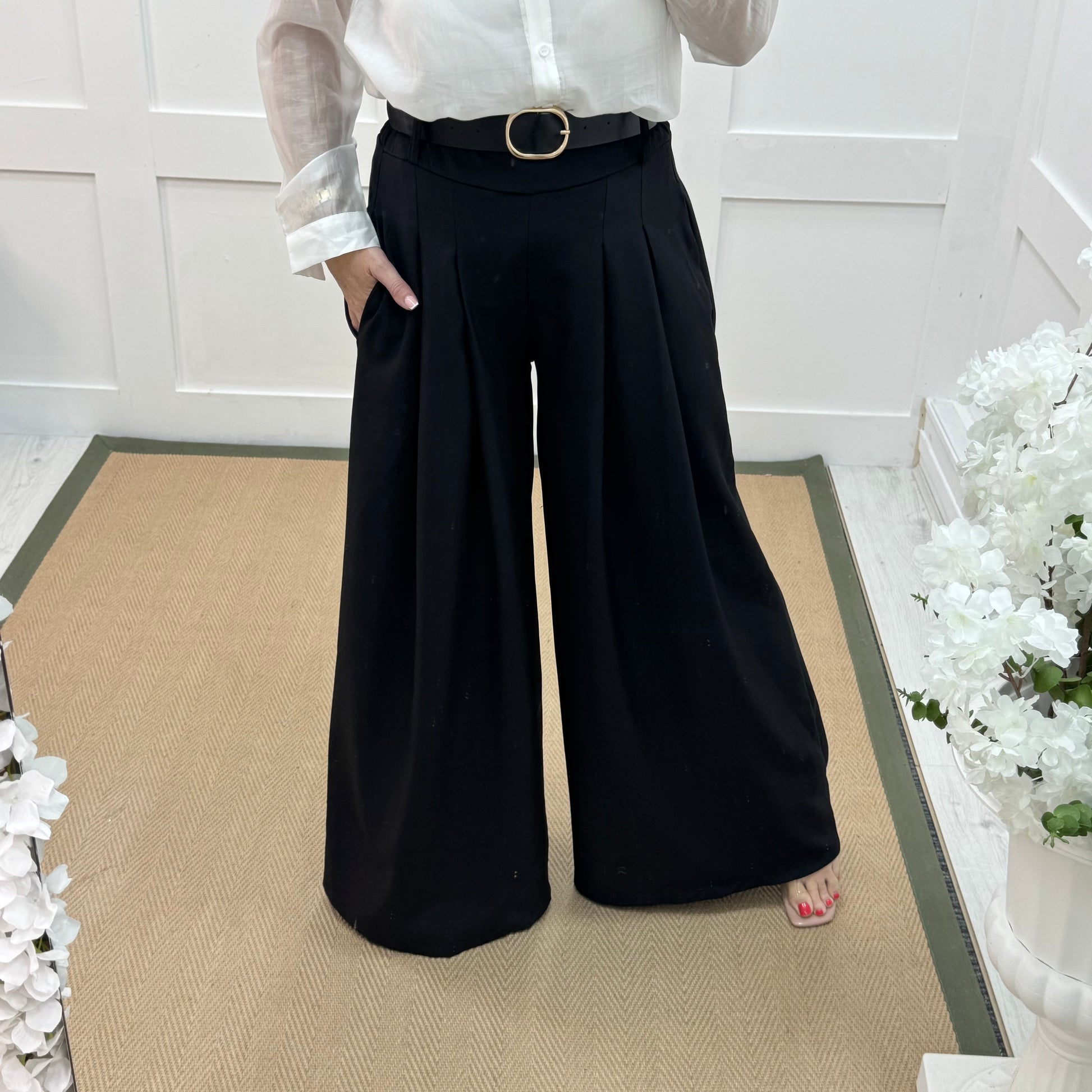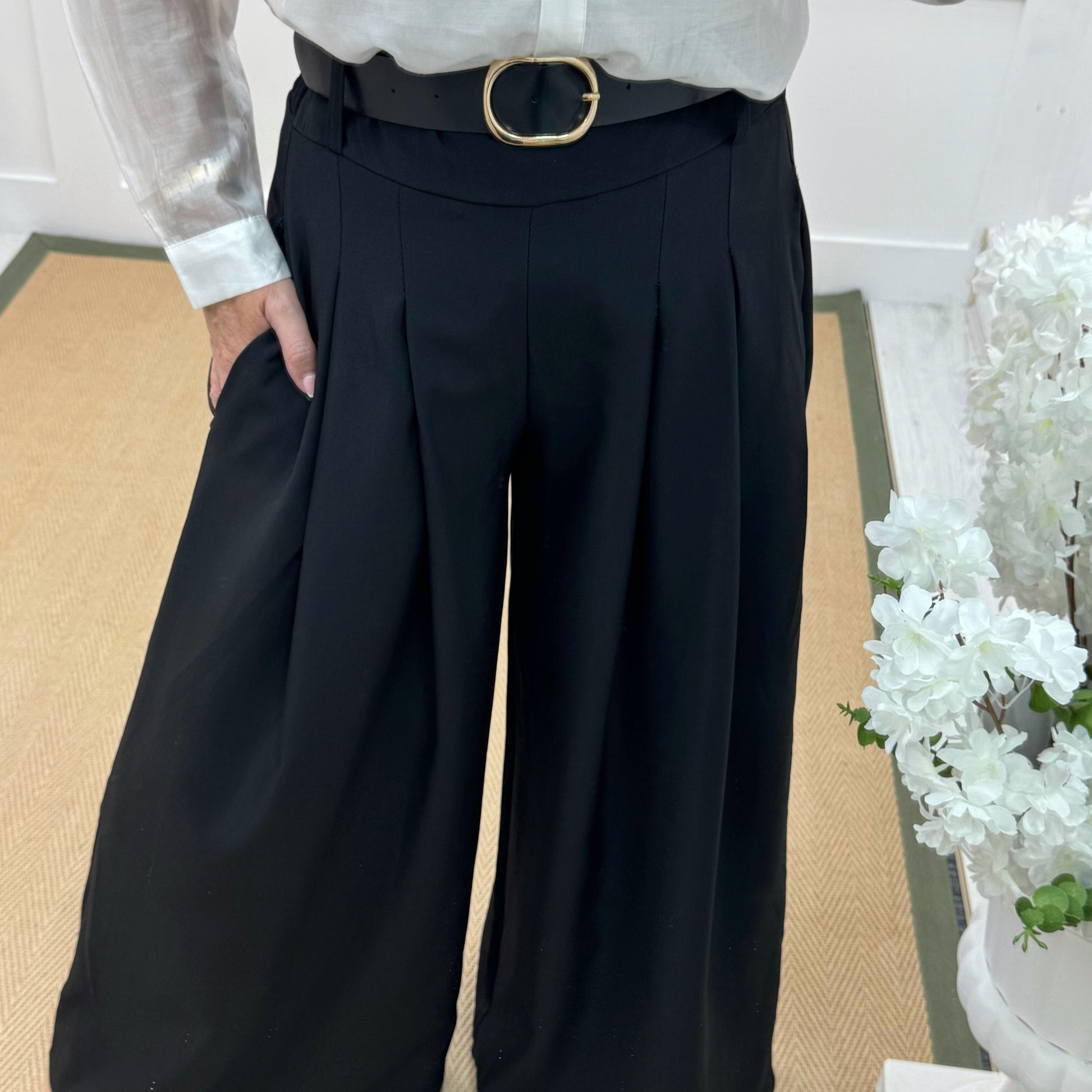 Zina: Black pocket wide leg trousers. One size: 8-14